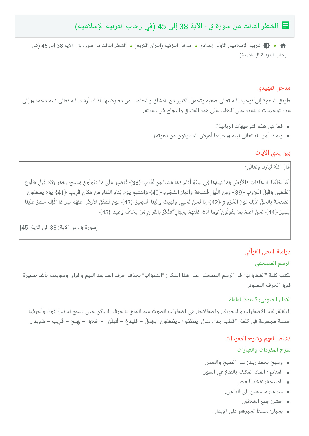 الشطر الثالث من سورة ق - الآية 38 إلى 45 (في رحاب التربية الإسلامية)