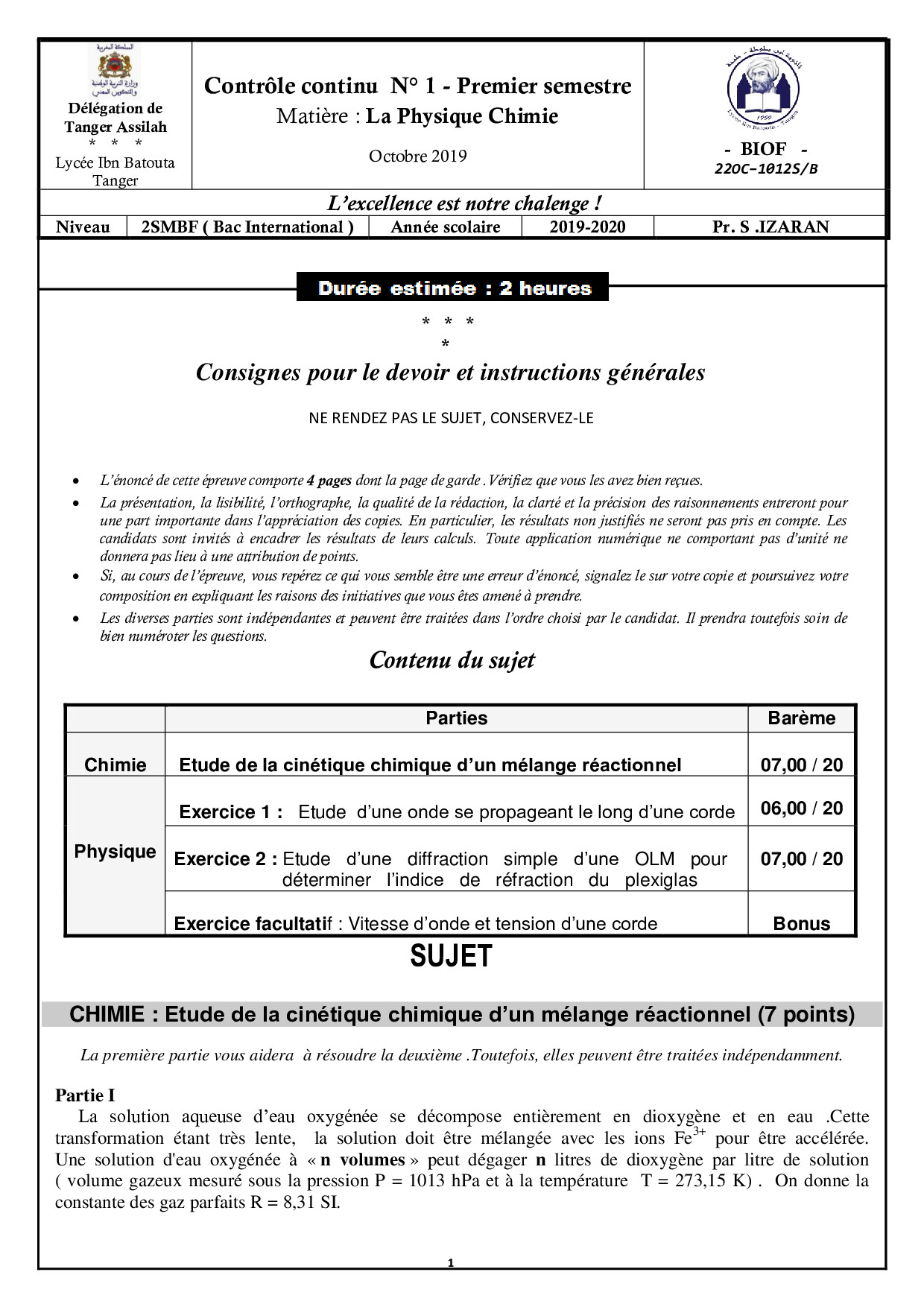 Devoir 1 Modèle 1 - Physique Chimie 2 Bac SM Semestre 1
