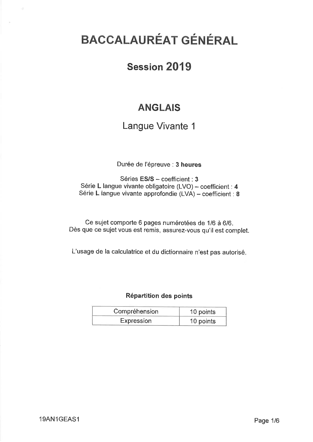 Bac S-ES-L Anglais LV1 Amérique du Sud 2019 - Sujet
