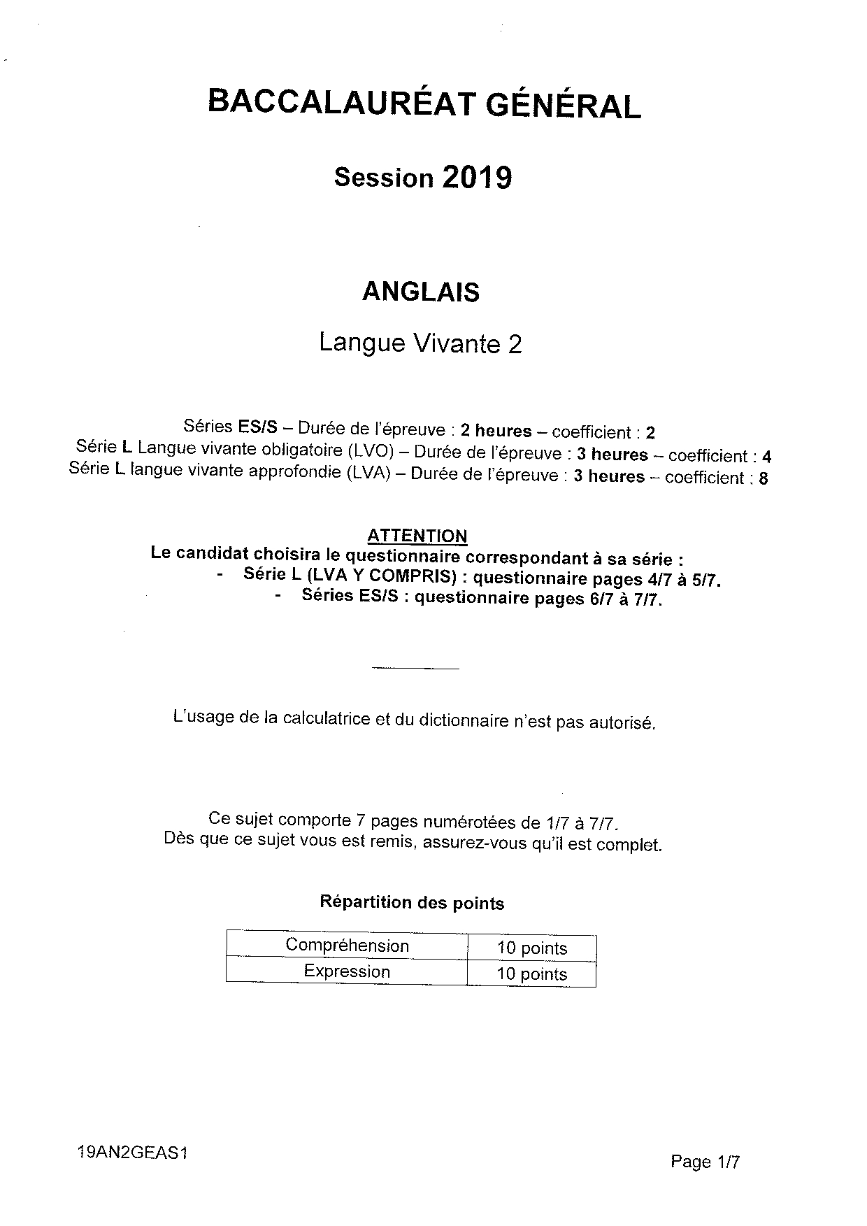 Bac S-ES-L Anglais LV2 Amérique du Sud 2019 - Sujet