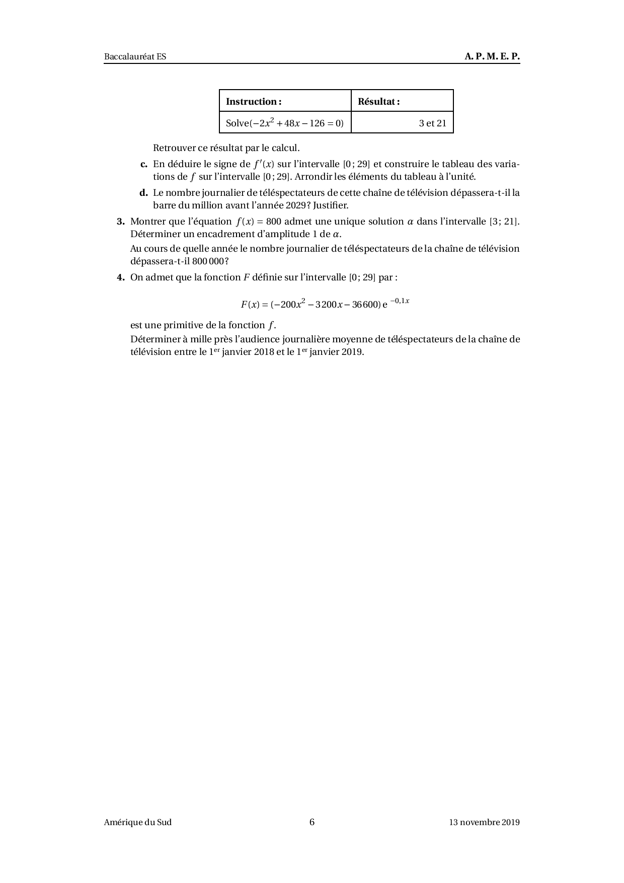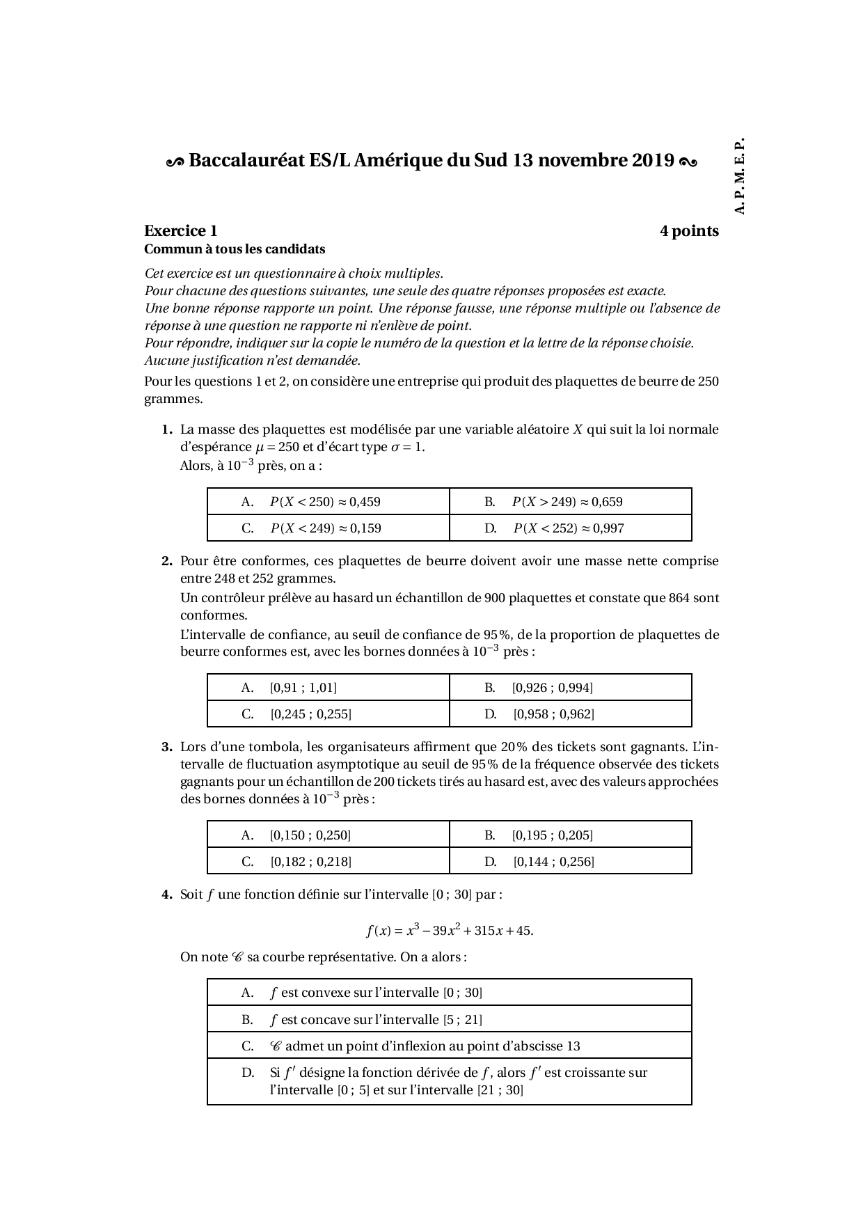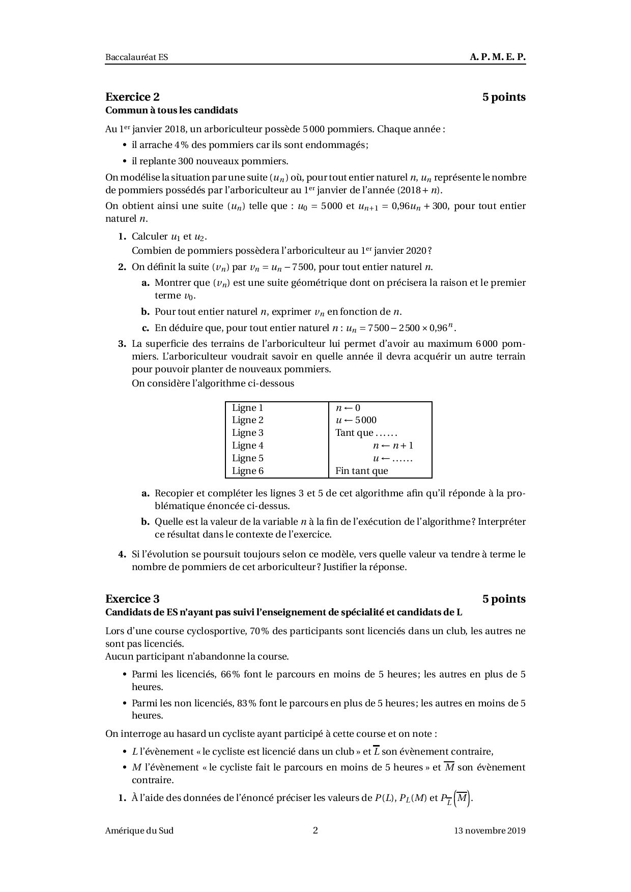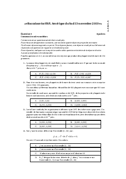 Annale Maths Bac ES-L Amérique du Sud novembre 2019 - Sujet