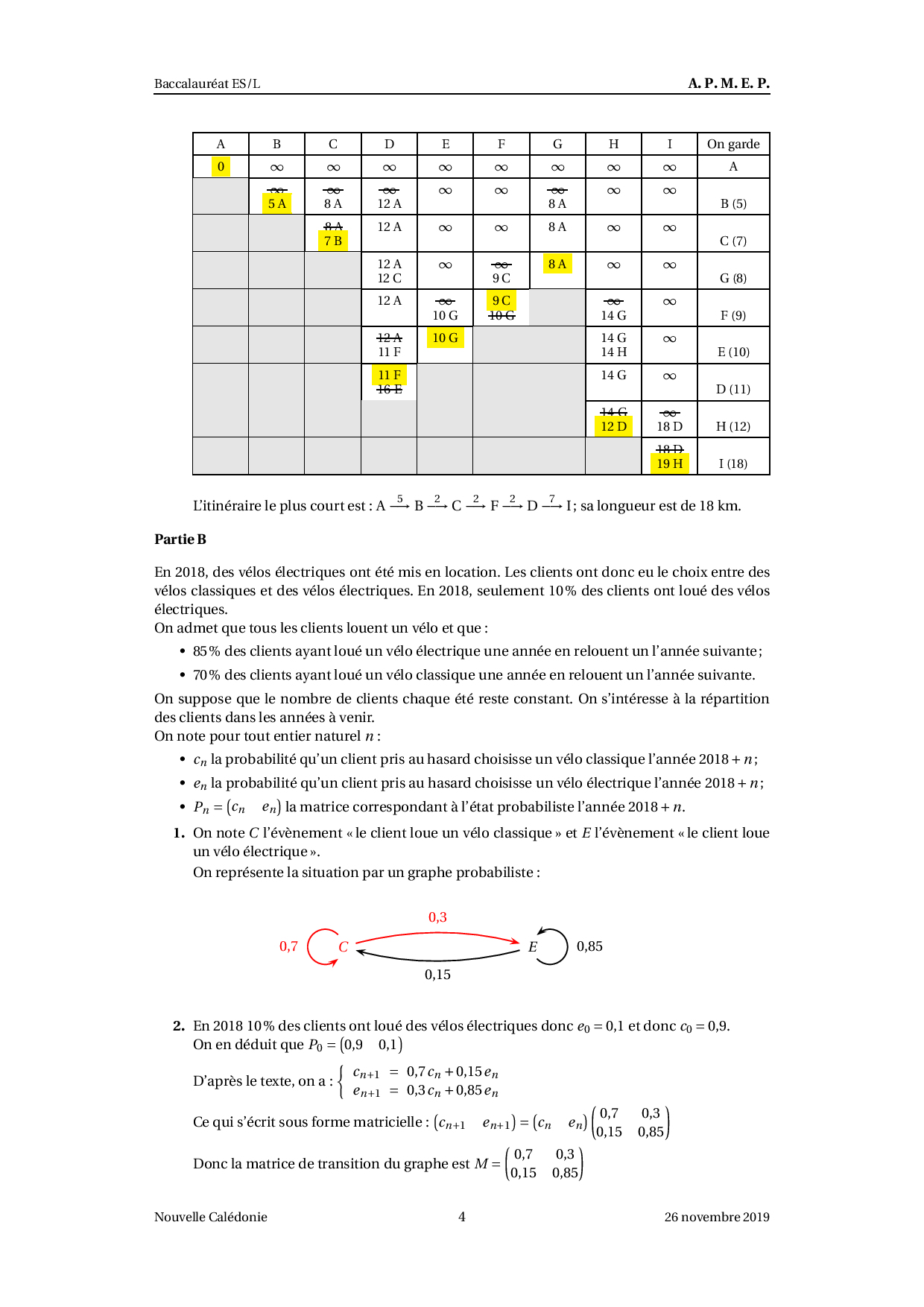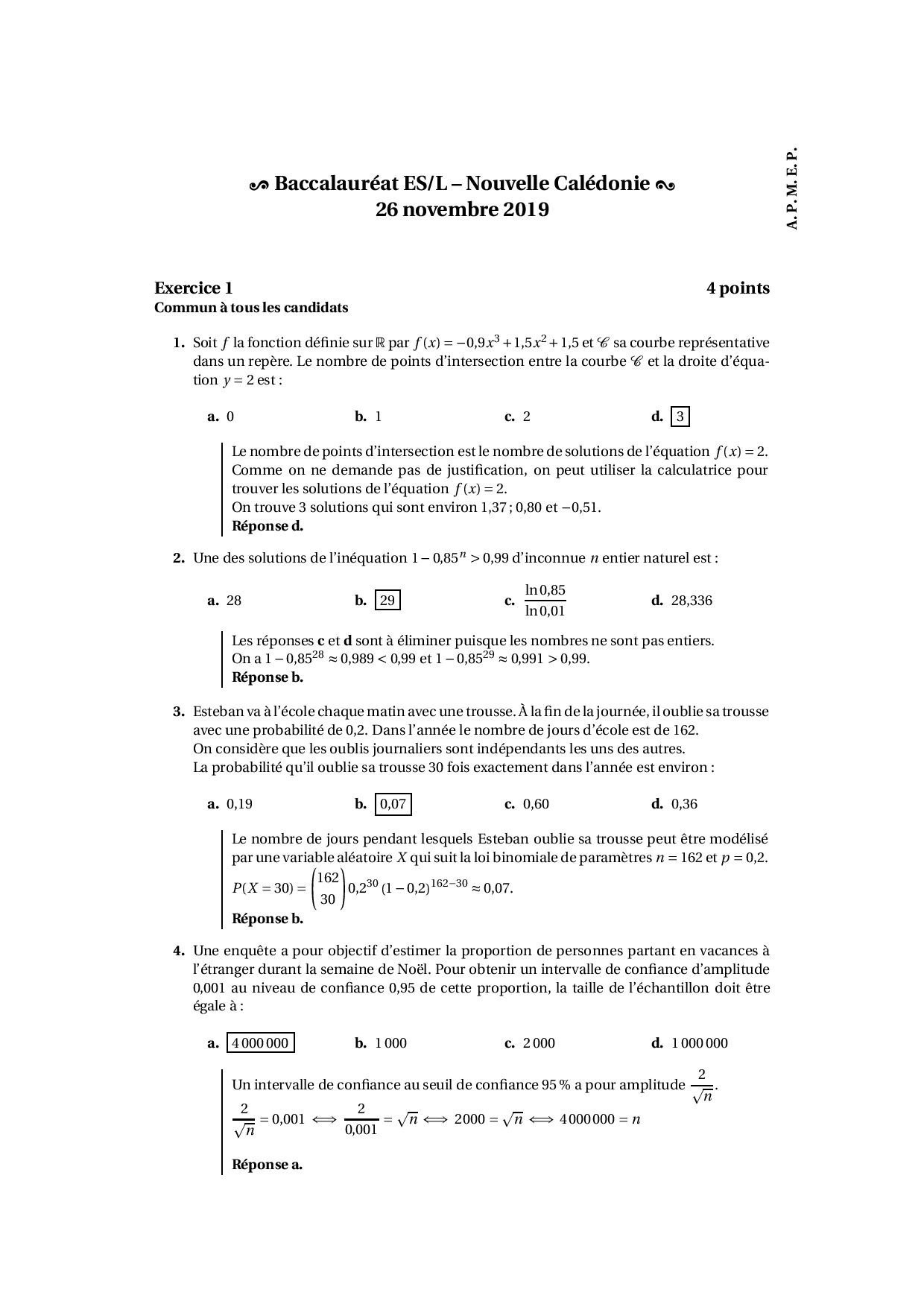 Annale Maths Bac ES-L Nouvelle Calédonie novembre 2019 - Corrigé