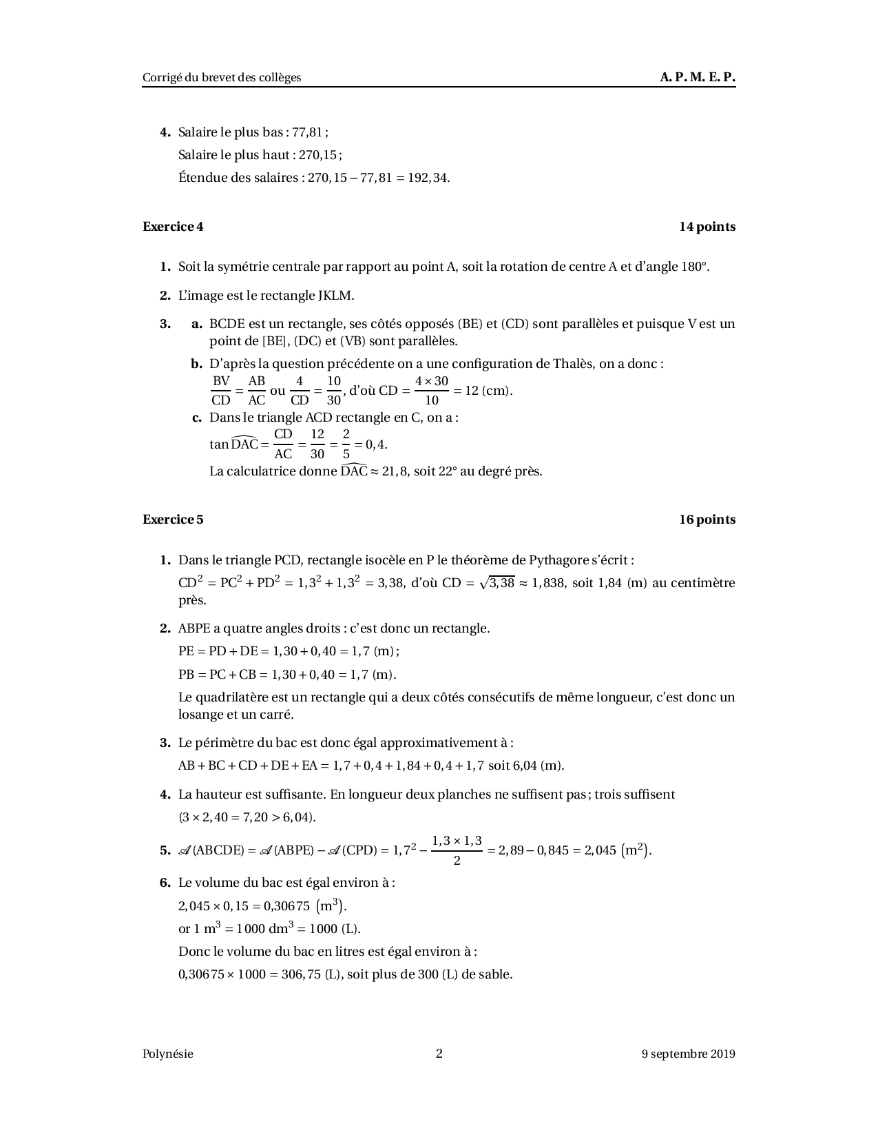 Brevet Maths Polynésie septembre 2019 - Corrigé