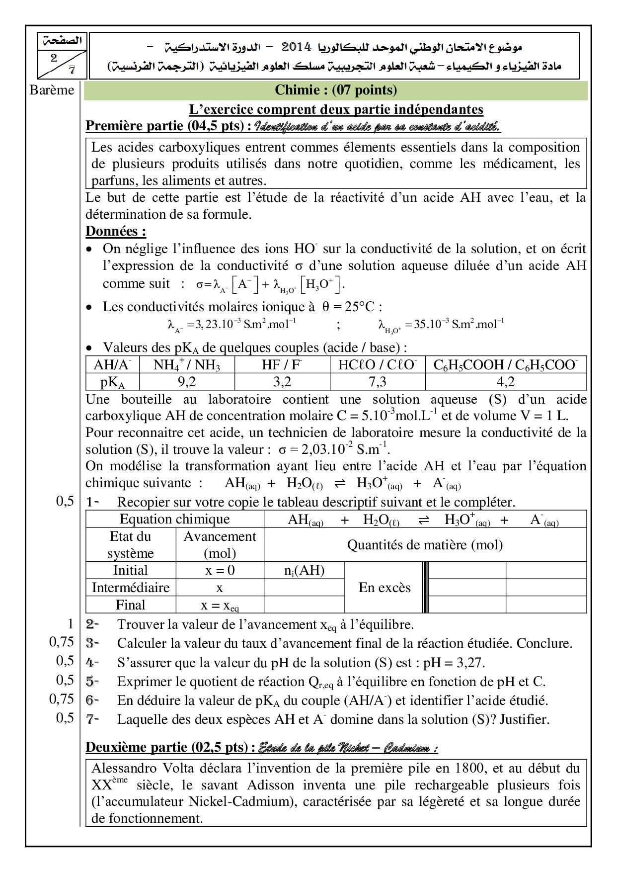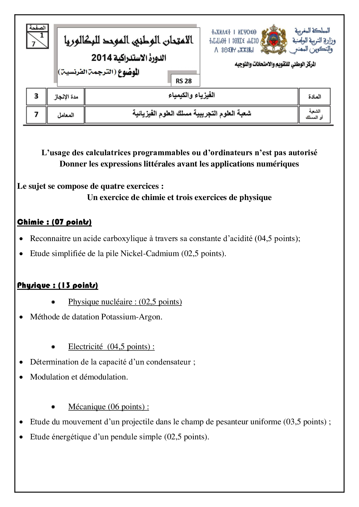 Examen National Physique-Chimie SPC 2014 Rattrapage - Sujet