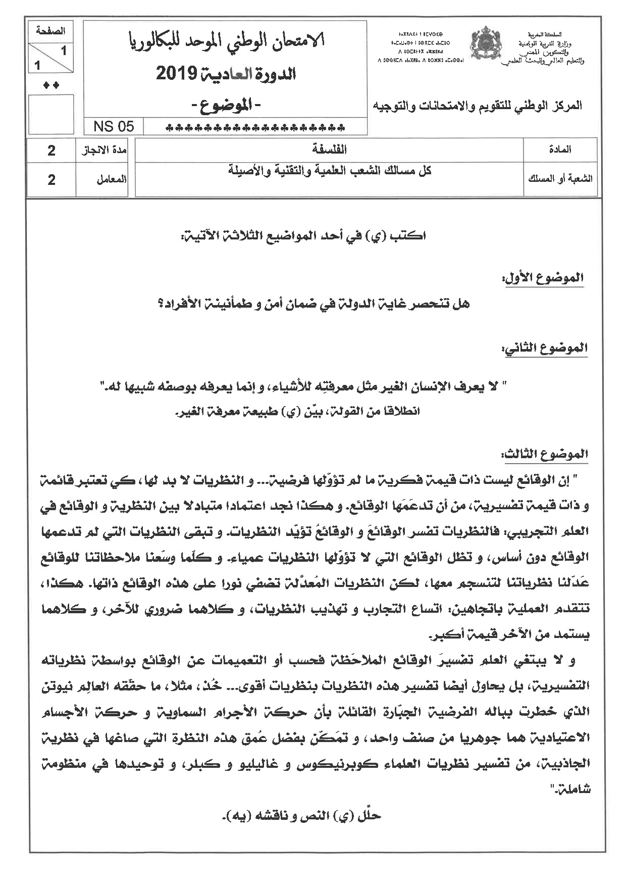 الفلسفة للشعب العلمية والتقنية 2019 الدورة العادية - الموضوع