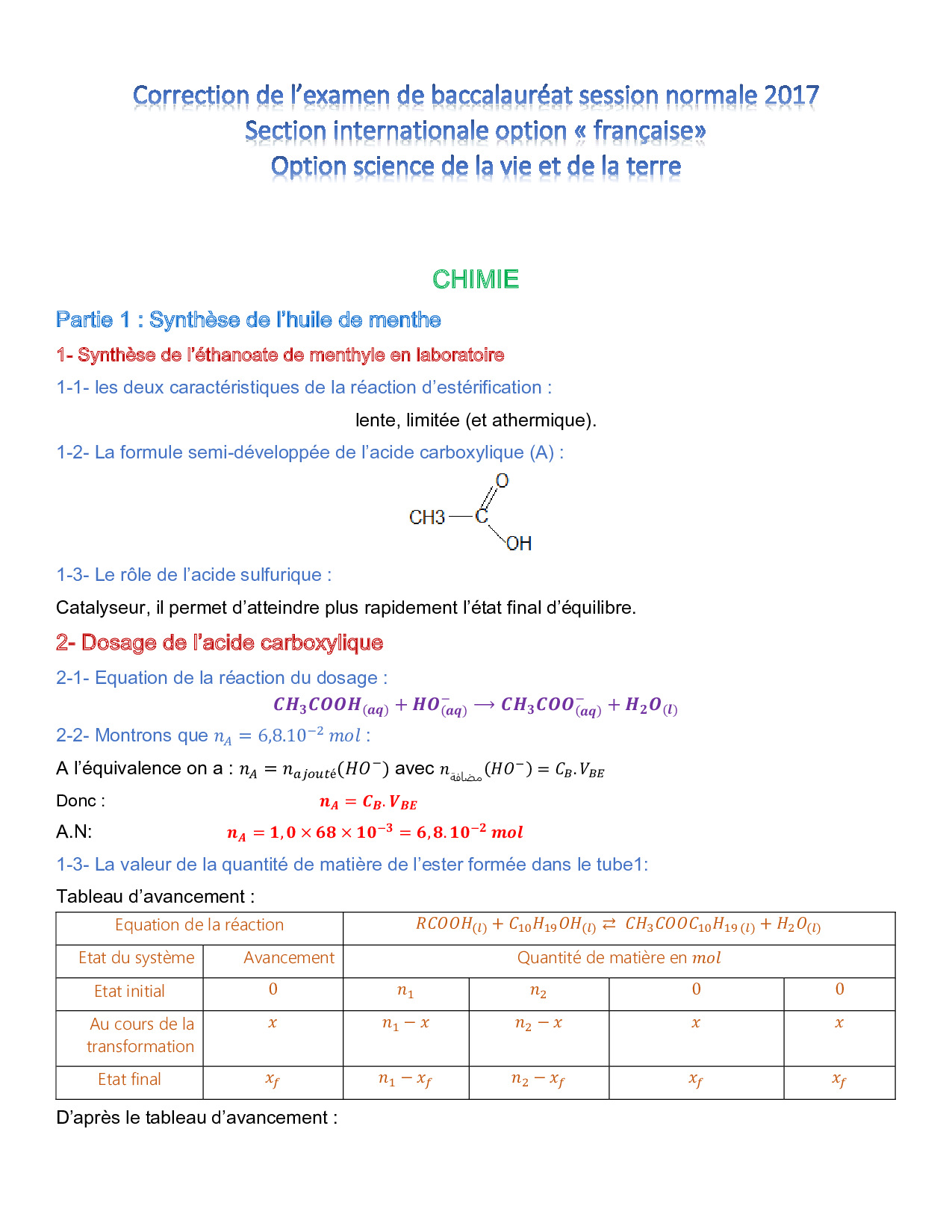 Examen National Physique-Chimie 2 Bac SVT 2017 Normale - Corrigé