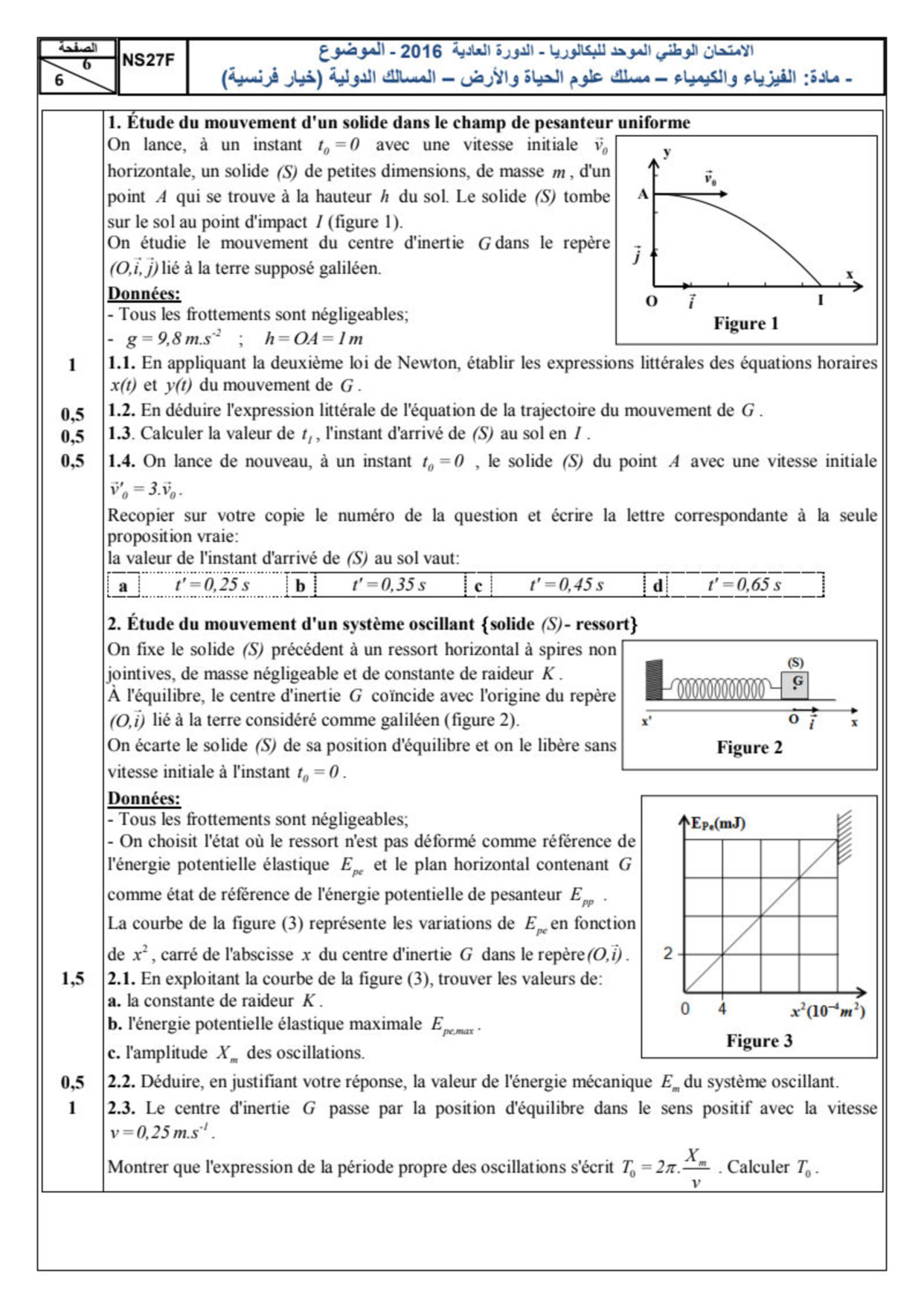 Examen National Physique-Chimie 2 Bac SVT 2016 Normale - Sujet