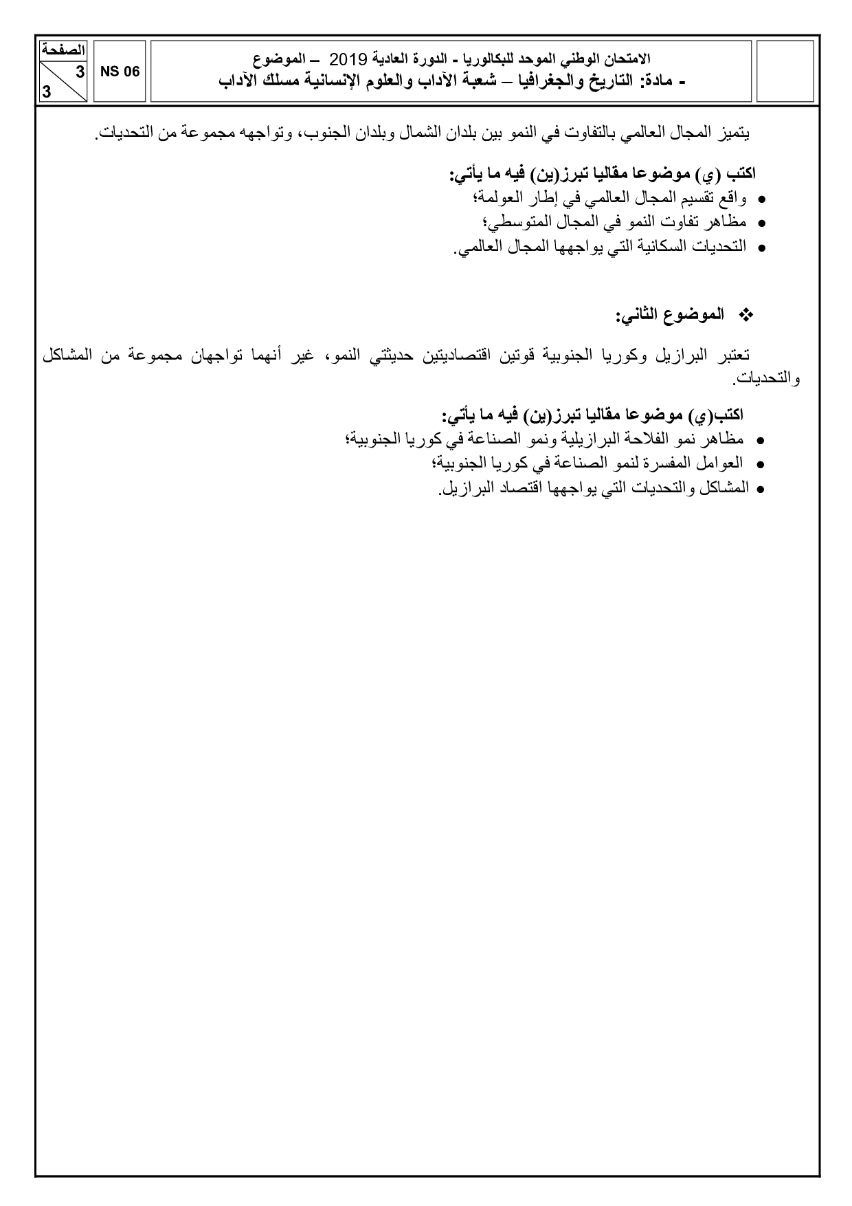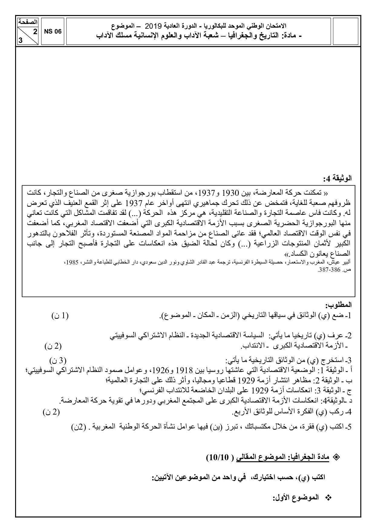 الإجتماعيات (شعبة الآداب) 2019 الدورة العادية - الموضوع