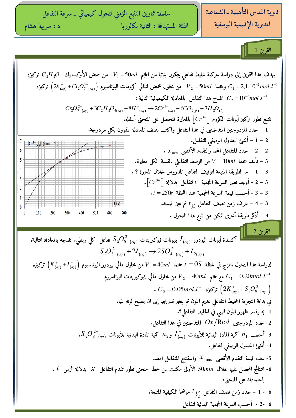 التتبع الزمني لتحول كيميائي - سرعة التفاعل - تمارين غير محلولة 3