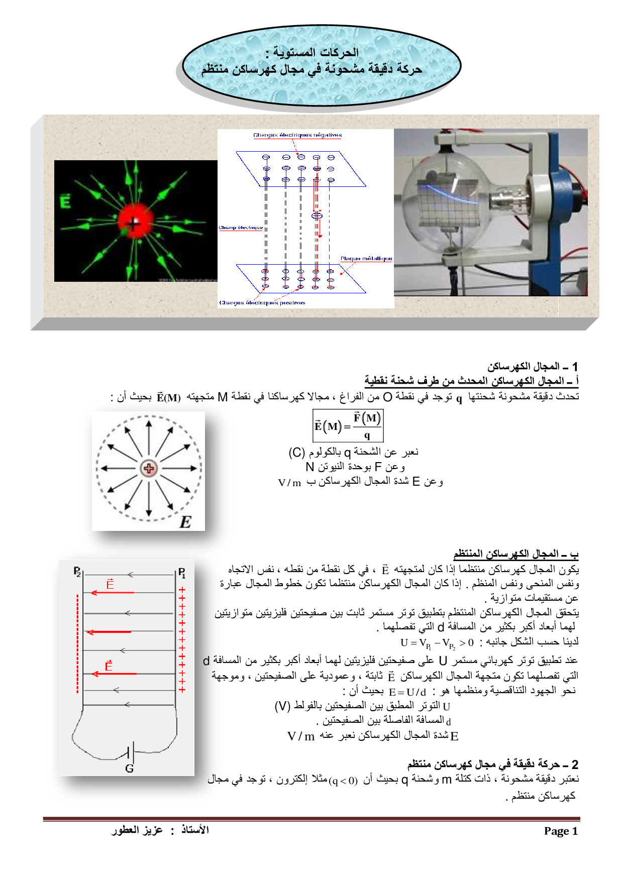 حركة دقيقة مشحونة في مجال كهرساكن منتظم - الدرس 1
