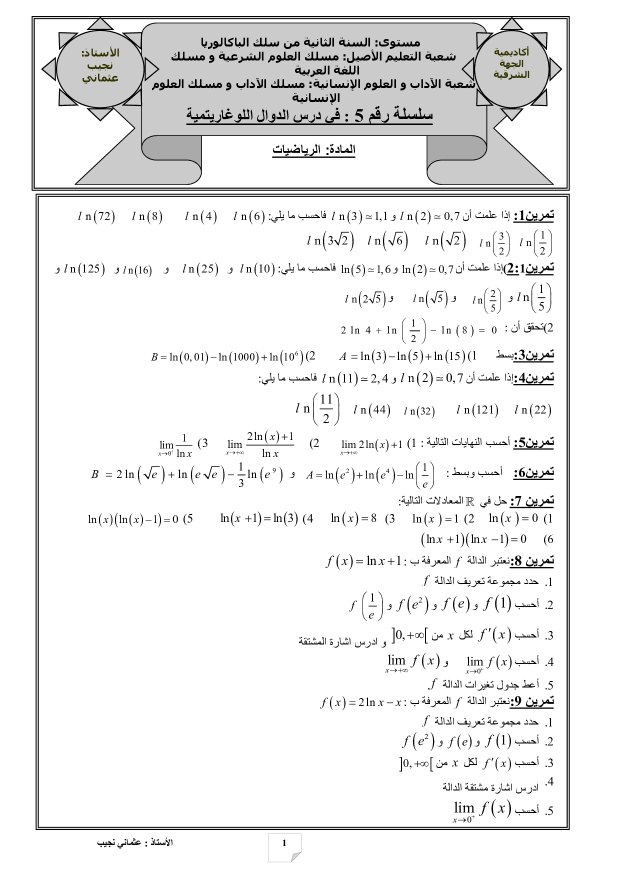 الدوال اللوغاريتمية - تمارين غير محلولة 1