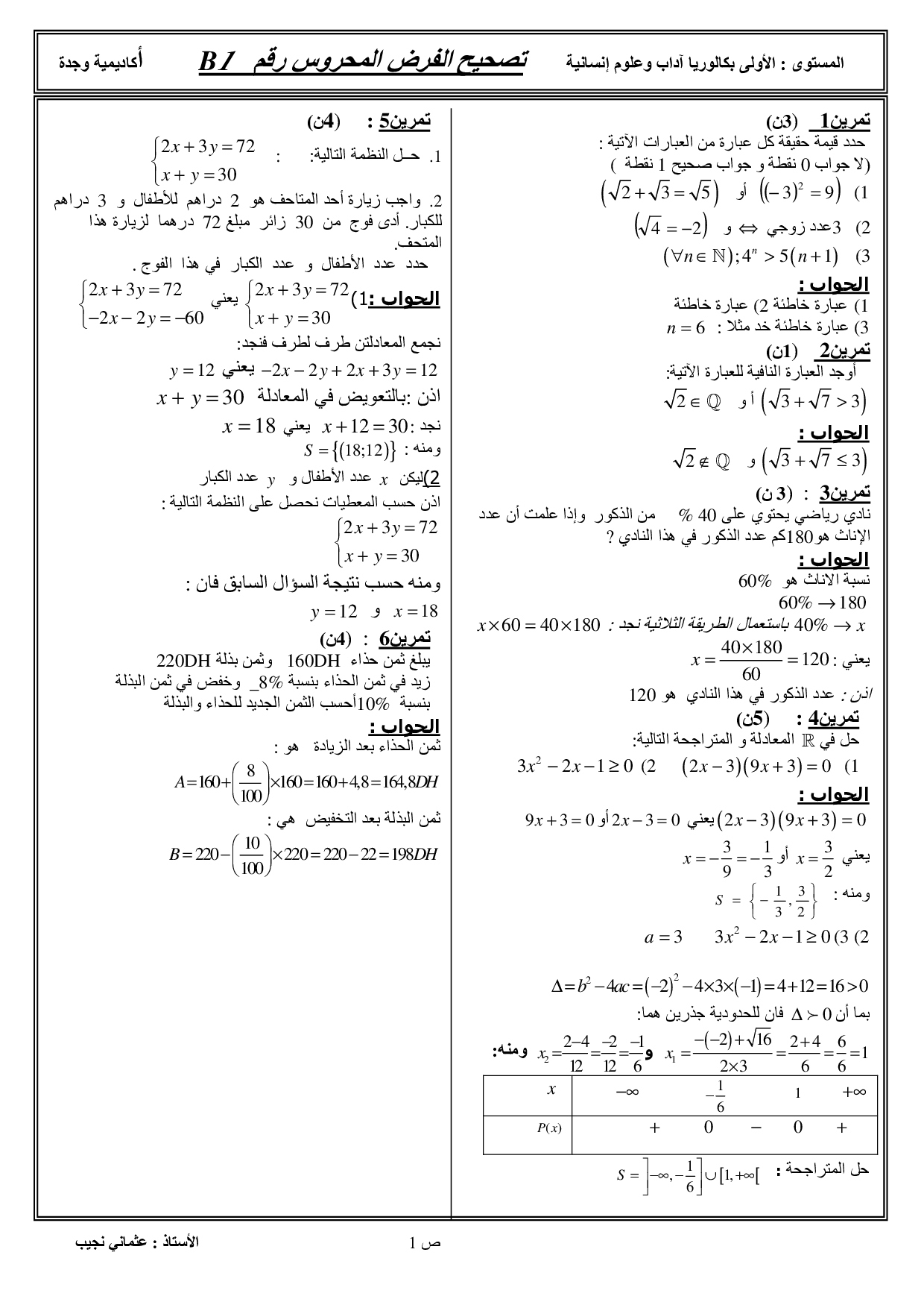 الفرض 1 نموذج 2 - الرياضيات أولى باك آداب وعلوم إنسانية الدورة الأولى (التصحيح)