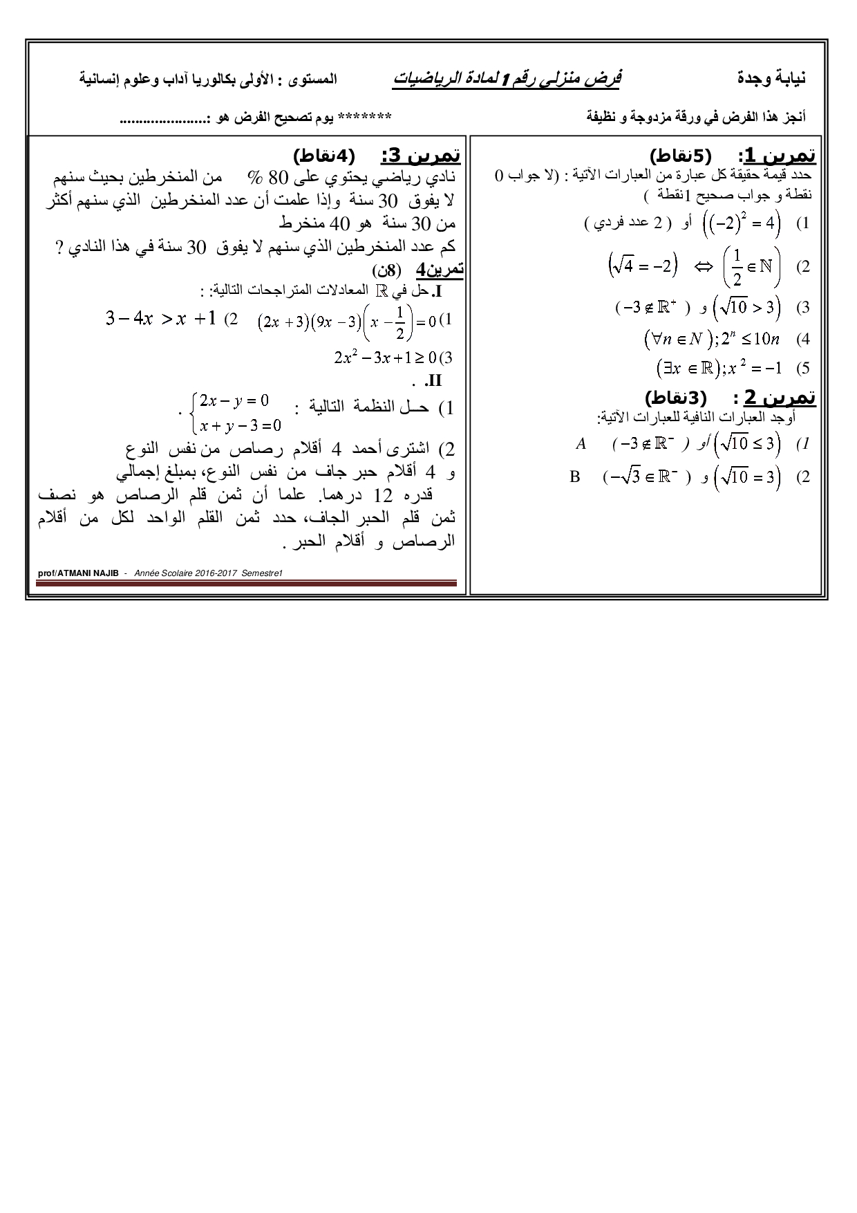 الفرض 1 نموذج 3 - الرياضيات أولى باك آداب وعلوم إنسانية الدورة الأولى