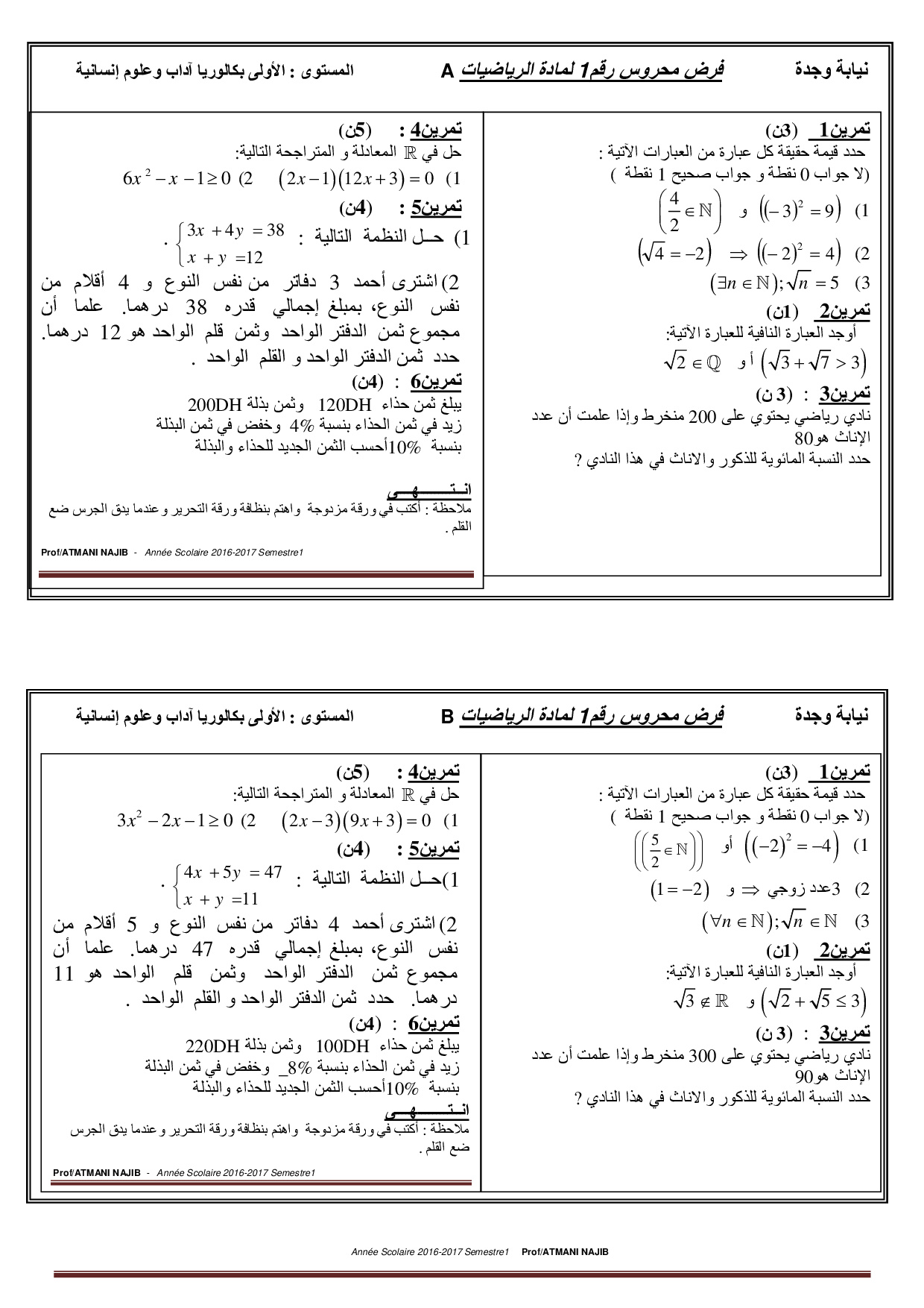 الفرض 1 نموذج 5 - الرياضيات أولى باك آداب وعلوم إنسانية الدورة الأولى