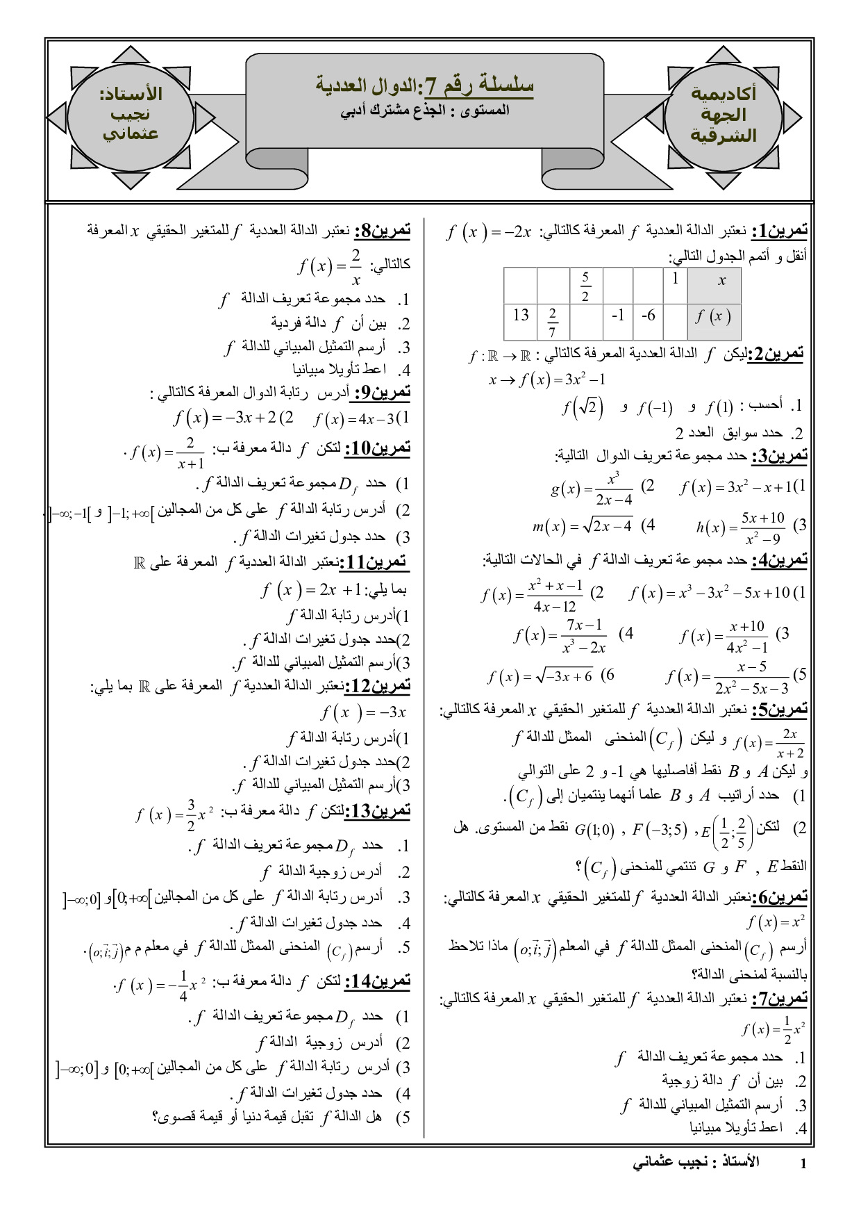 الدوال العددية - تمارين غير محلولة 1