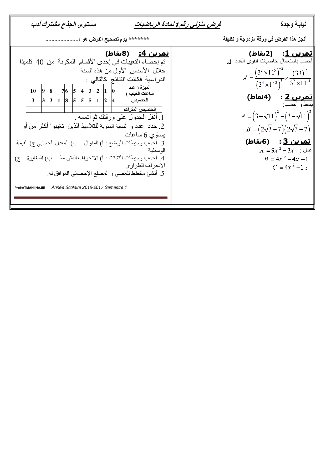 الفرض 1 نموذج 3 - الرياضيات جذع مشترك آداب وعلوم إنسانية الدورة الأولى