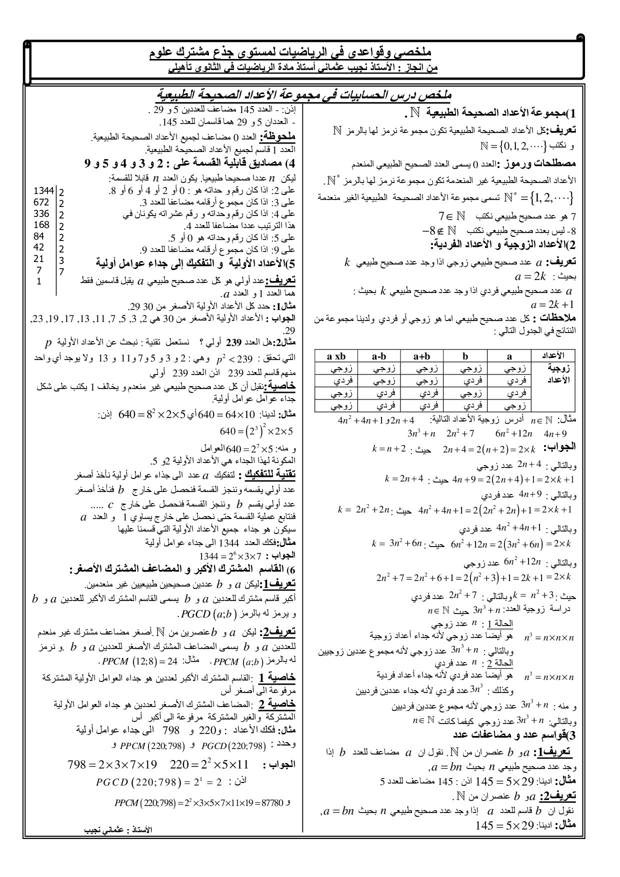 الأعداد الصحيحة الطبيعية ومبادئ في الحسابيات - ملخص الدرس 3