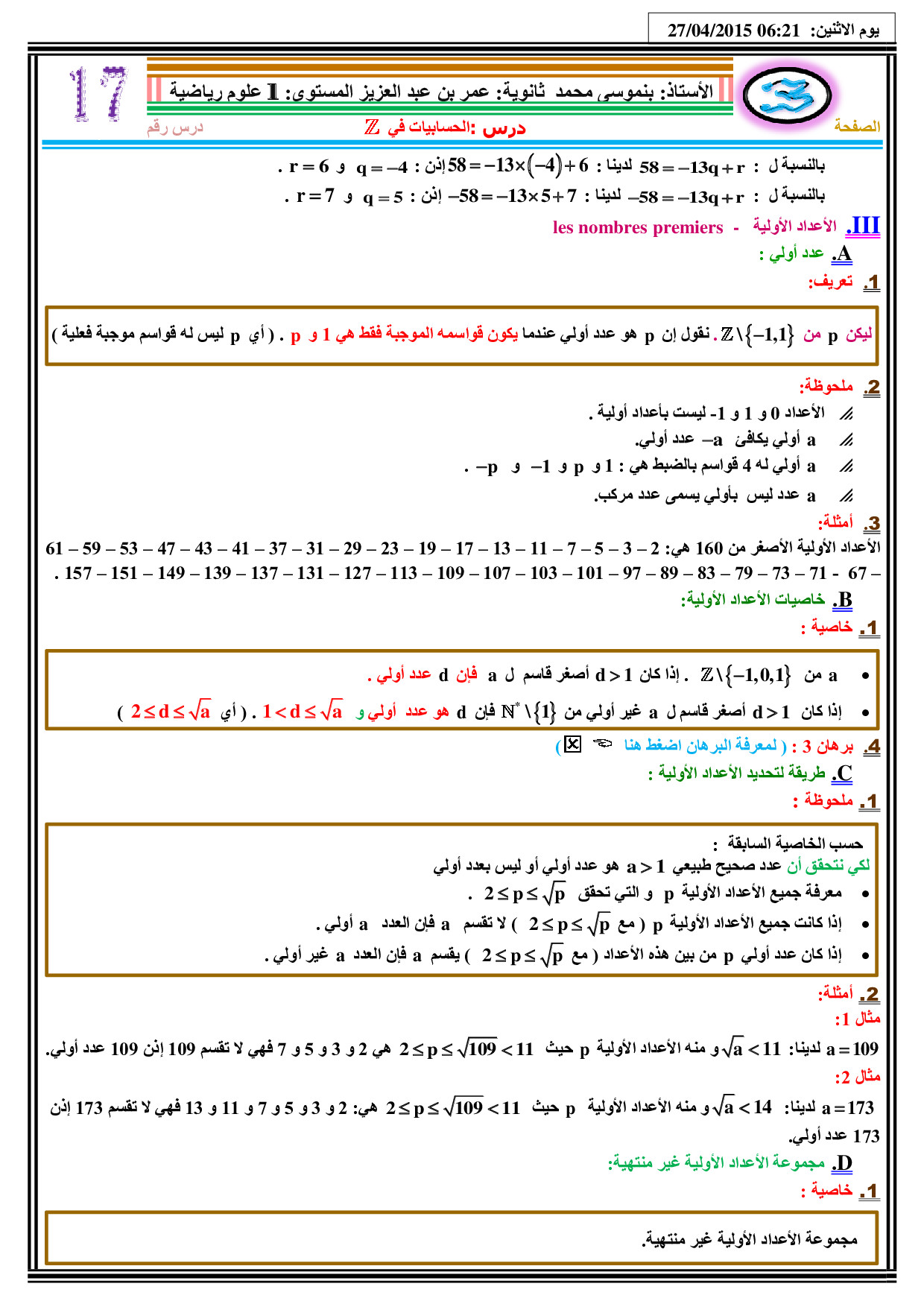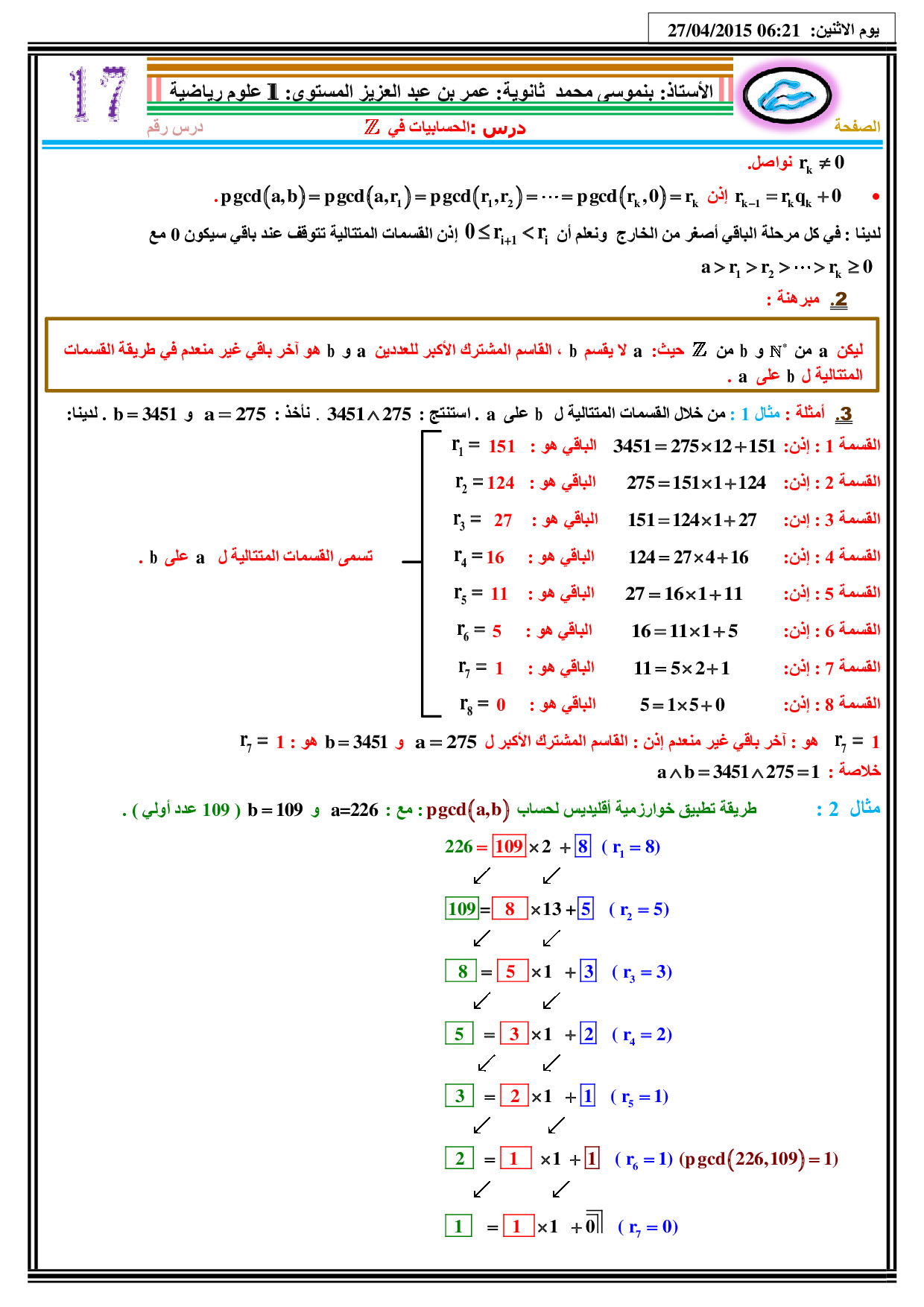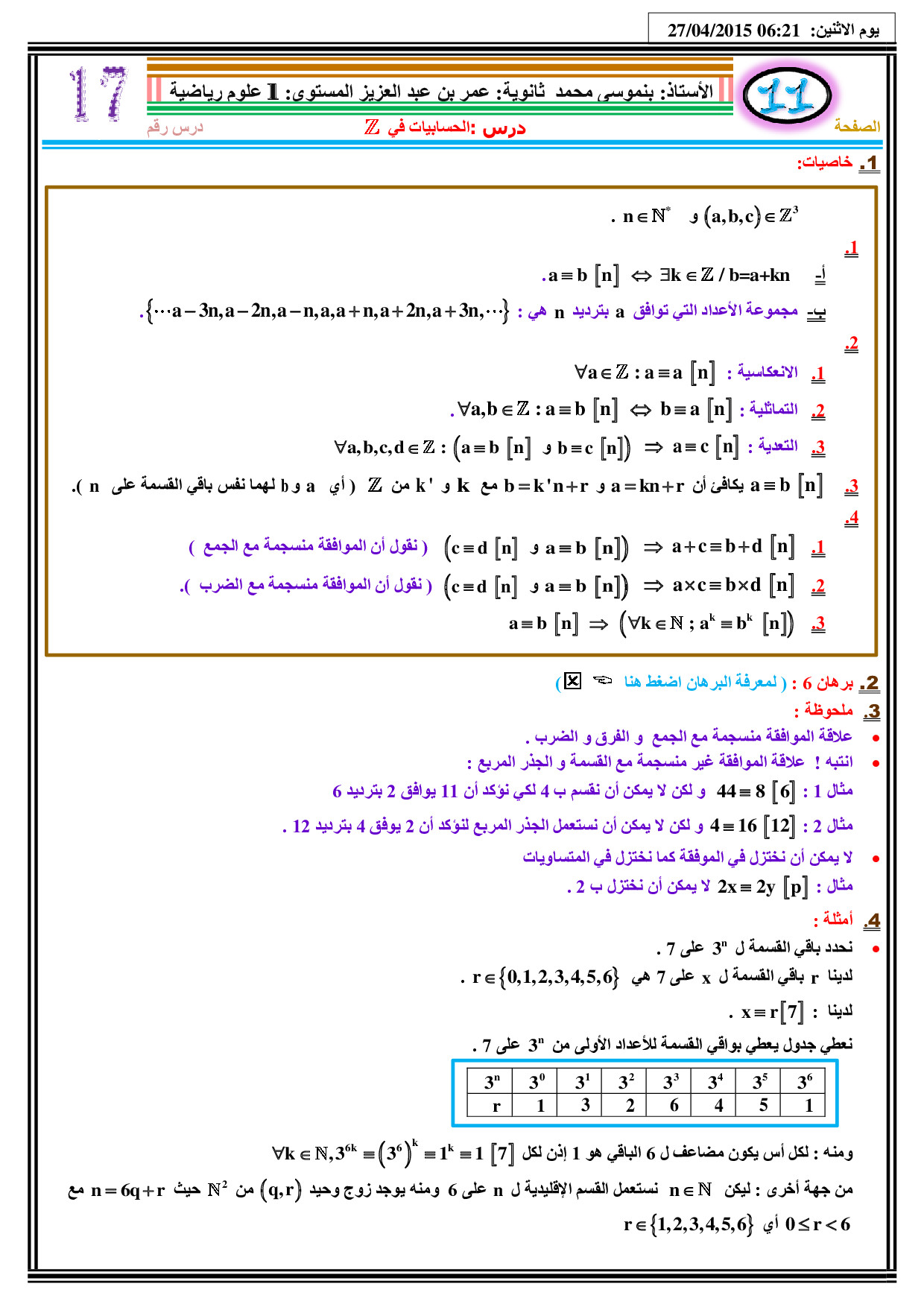 الحسابيات في Z - الدرس 1