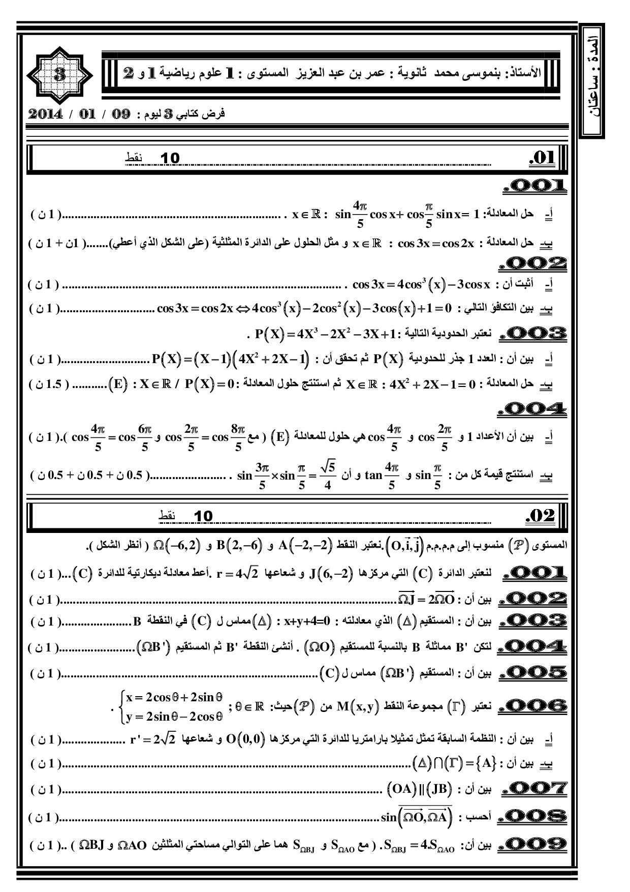 الفرض 3 نموذج 13 - الرياضيات أولى باك علوم رياضية الدورة الأولى