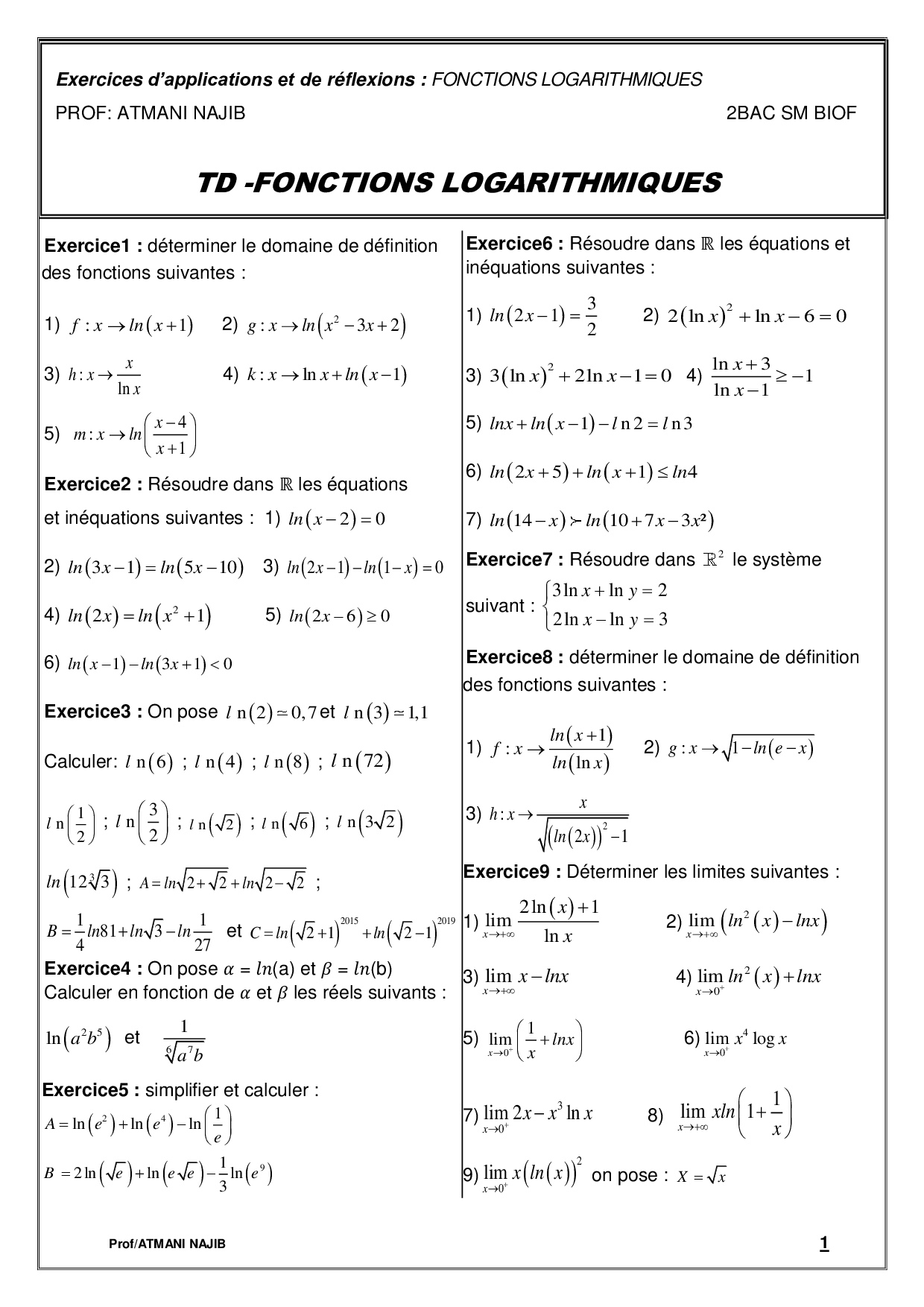 Fonctions logarithmiques - Série d'exercices 1
