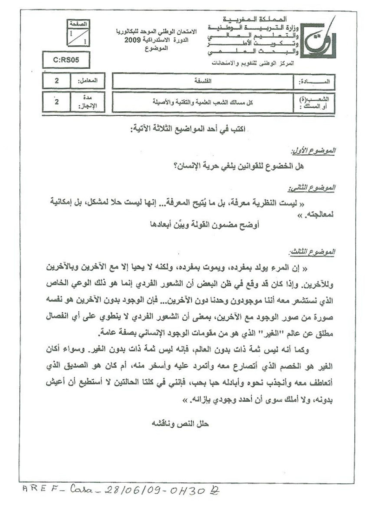 الفلسفة للشعب العلمية والتقنية 2009 الدورة الإستدراكية - الموضوع