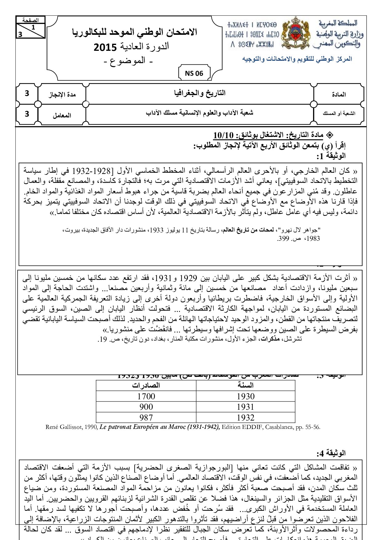 الإجتماعيات (شعبة الآداب) 2015 الدورة العادية - الموضوع
