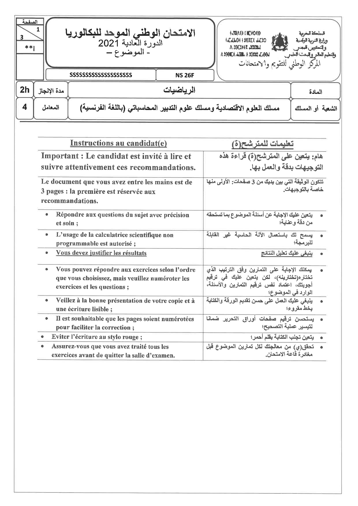 Examen National Maths 2Bac Eco-SGC 2021 Normale - Sujet