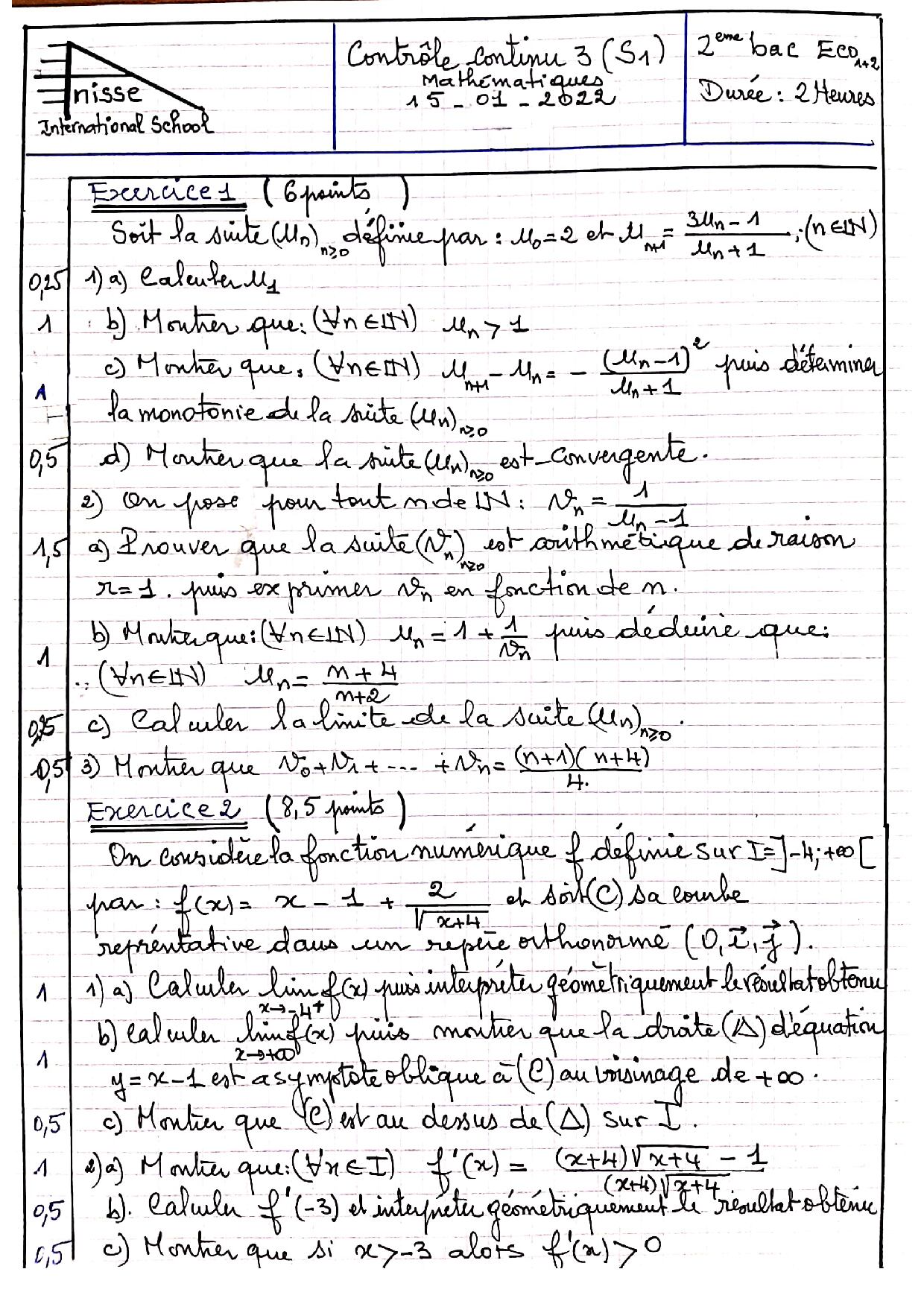 Devoir 3 Modèle 7 - Mathématiques 2 Bac Eco-SGC Semestre 1