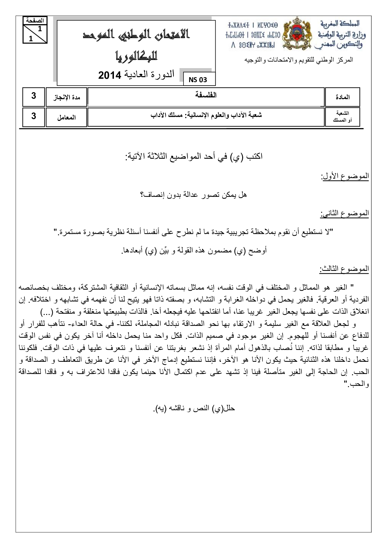 الفلسفة (شعبة الآداب) 2014 الدورة العادية - الموضوع
