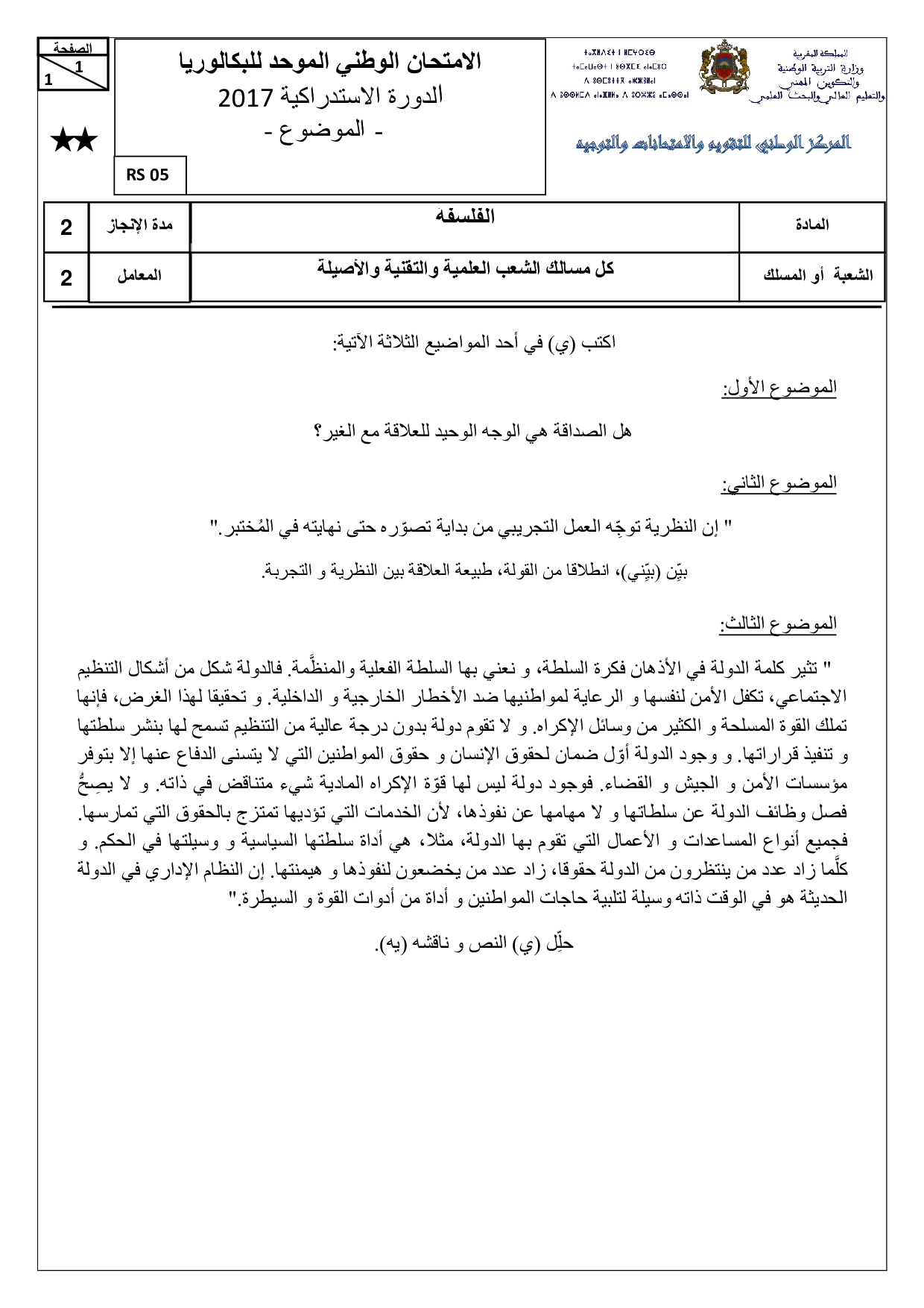 الفلسفة للشعب العلمية والتقنية 2017 الدورة الإستدراكية - الموضوع