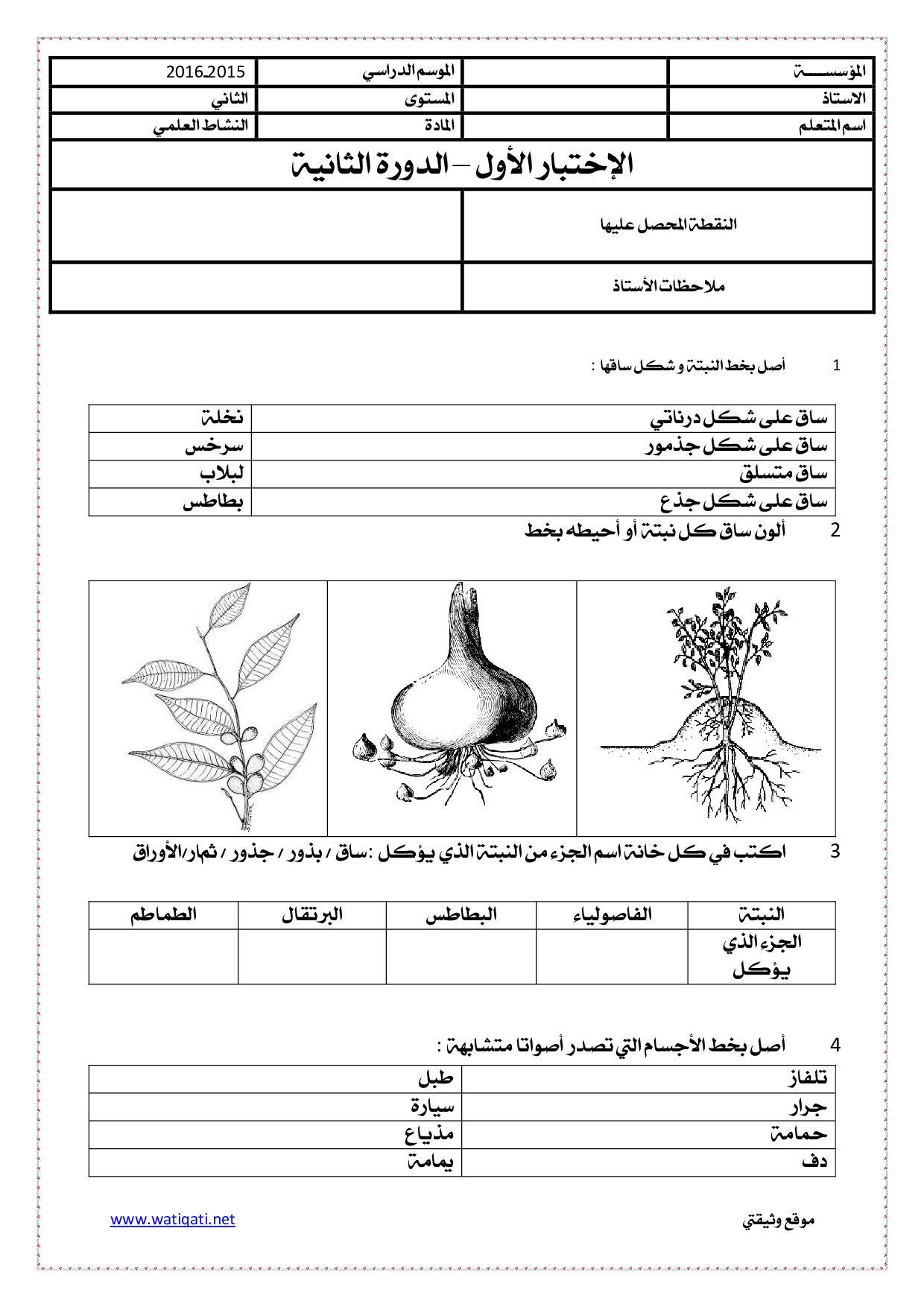 الفرض 1 نموذج 2 - النشاط العلمي ثاني إبتدائي الدورة الثانية