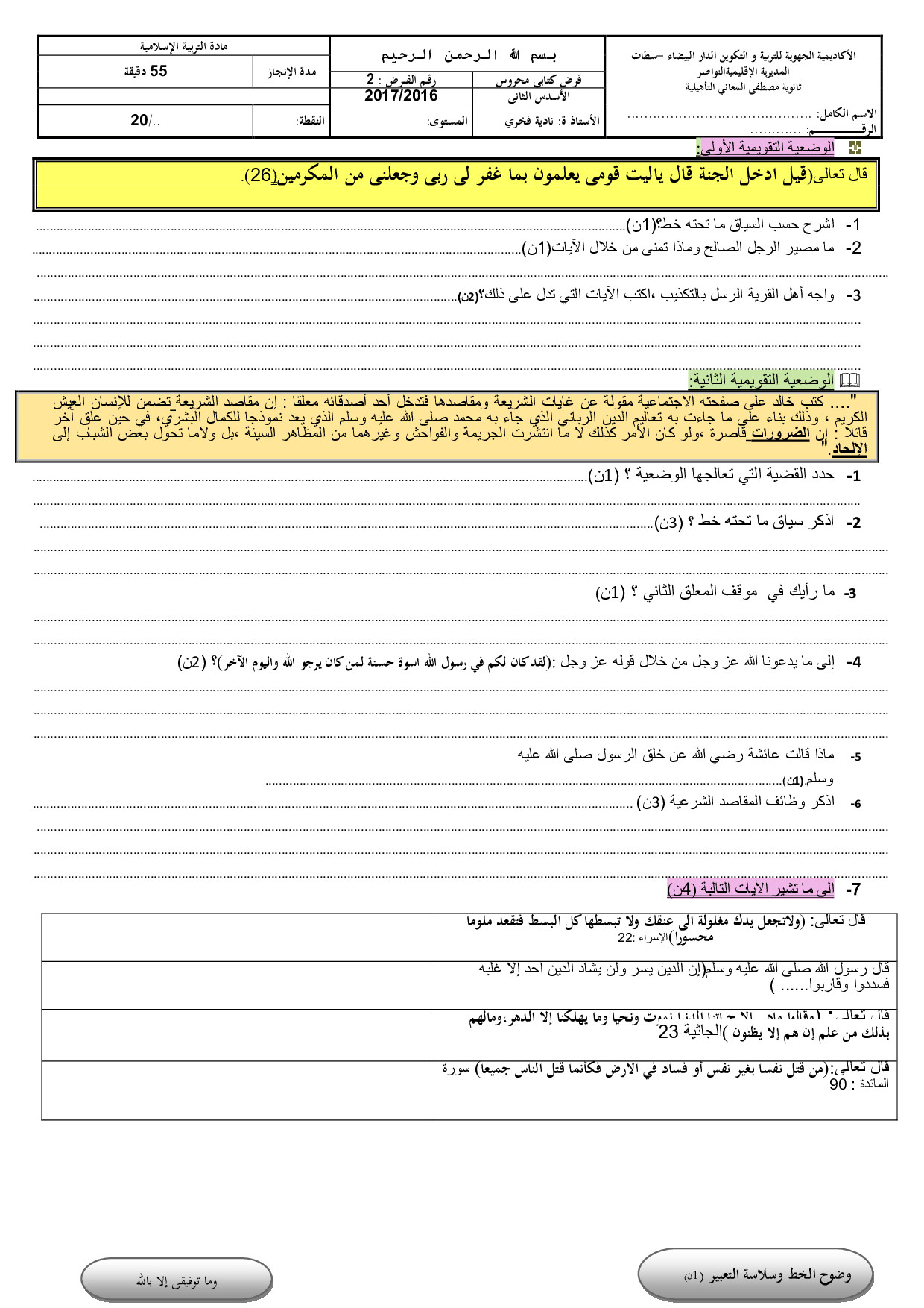 الفرض 2 نموذج 2 - التربية الإسلامية أولى باك الدورة الثانية