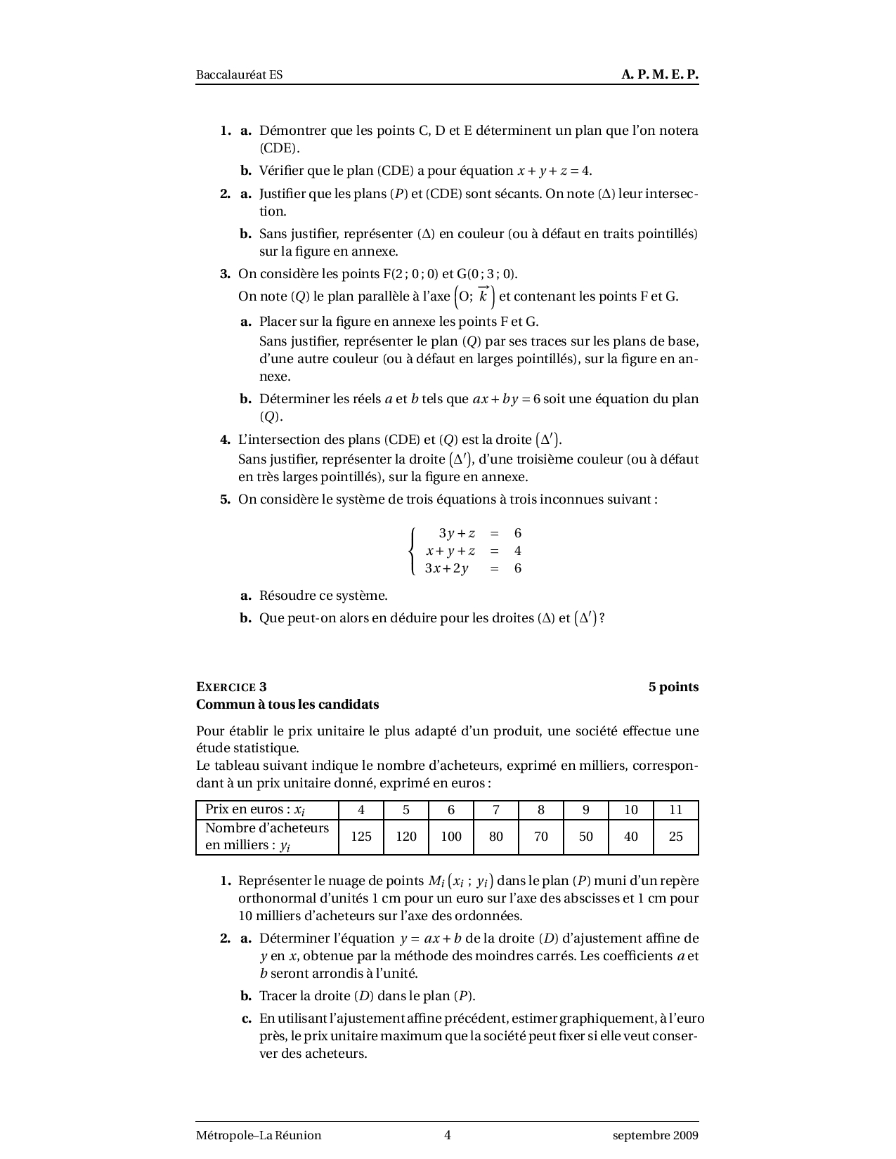 Annale Maths Bac ES Métropole La Réunion septembre 2009 - Sujet