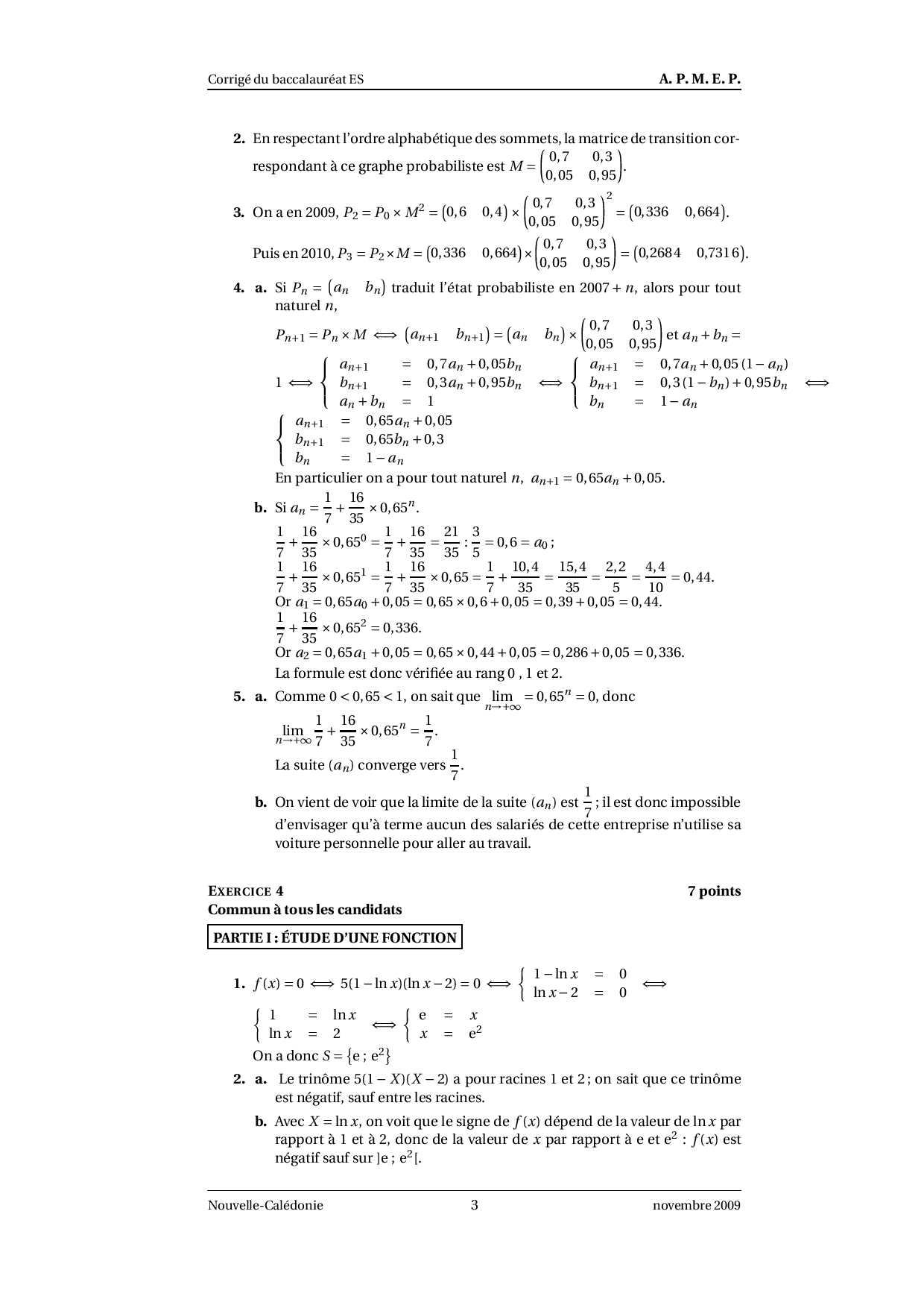 Annale Maths Bac ES Nouvelle calédonie novembre 2009 - Corrigé