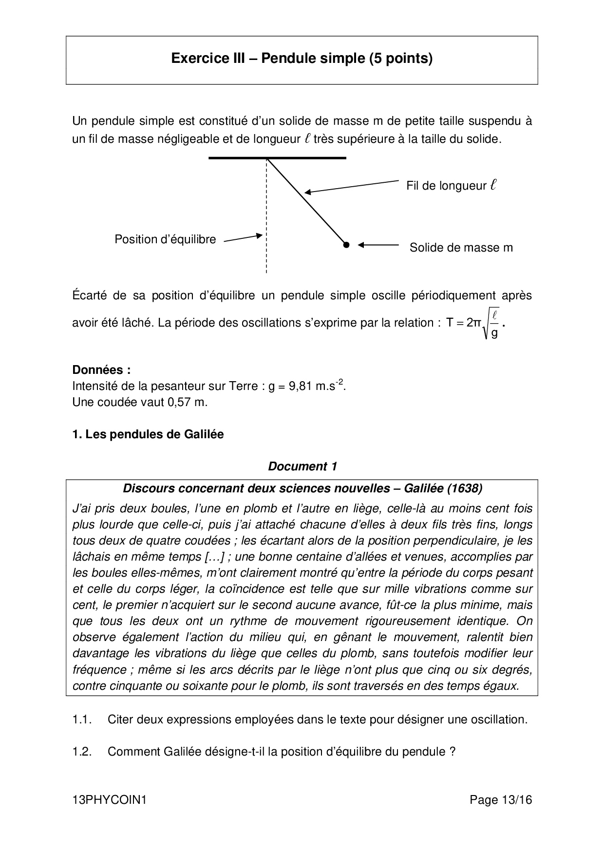 Bac S Physique Chimie Pondichéry 2013 - Sujet