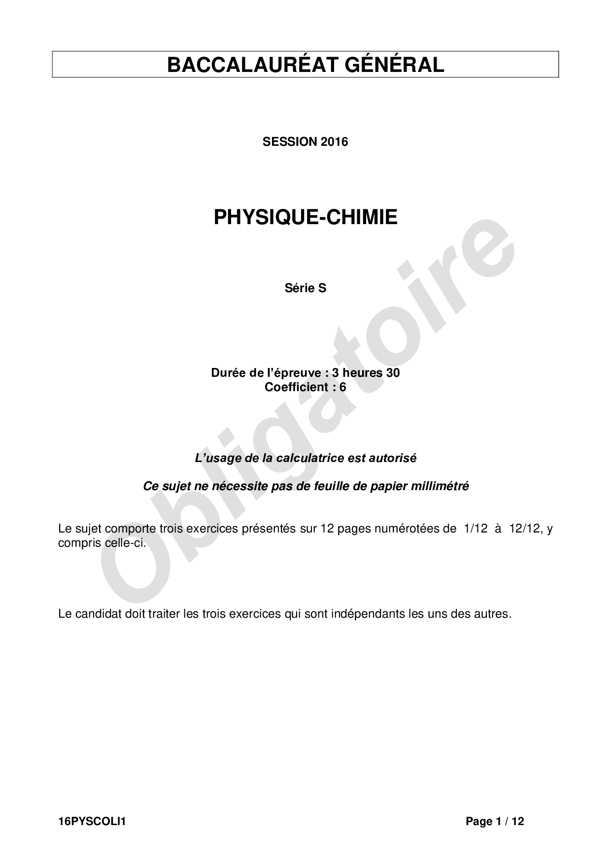 Bac S Physique Chimie Liban 2016 - Sujet