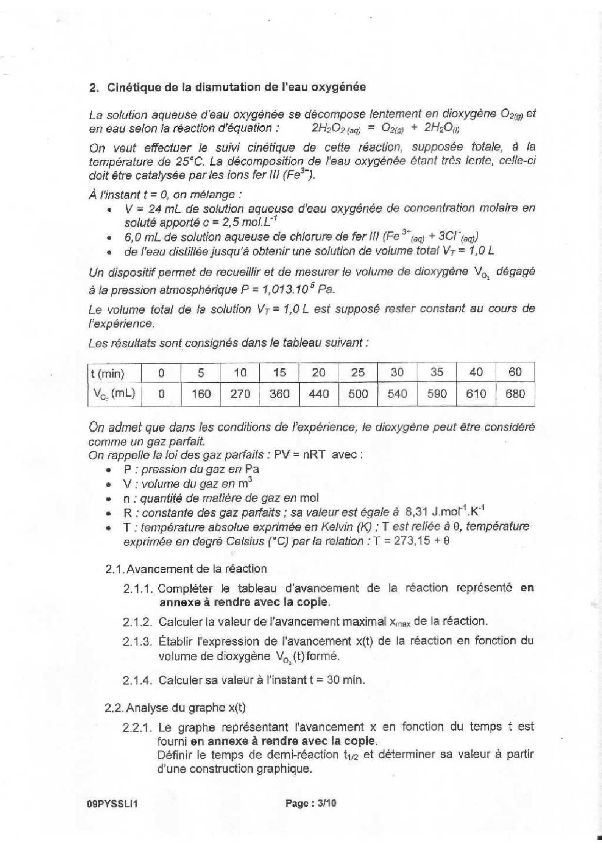Bac S Physique Chimie (Spécialité) Liban 2009 - Sujet