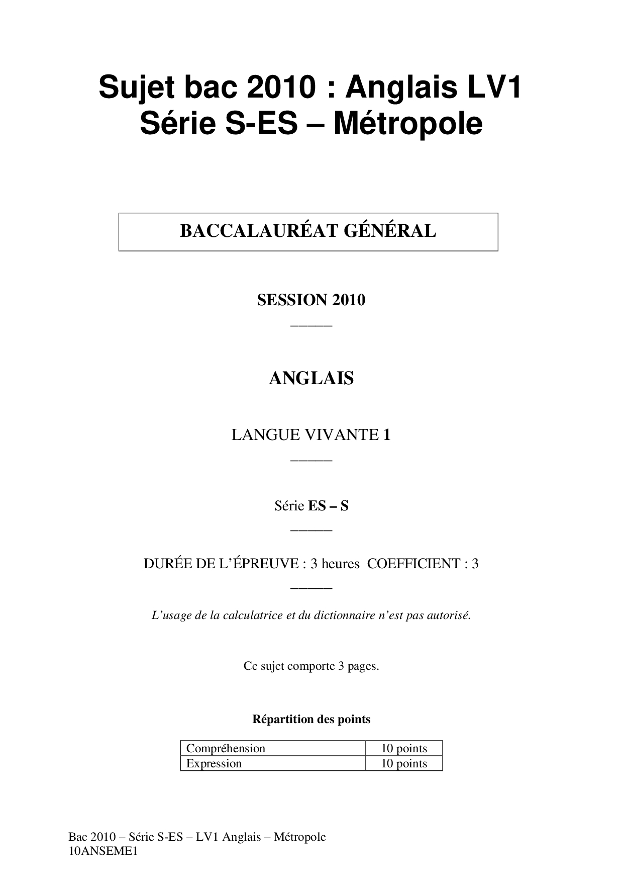 Bac S-ES Anglais LV1 Métropole 2010 - Sujet