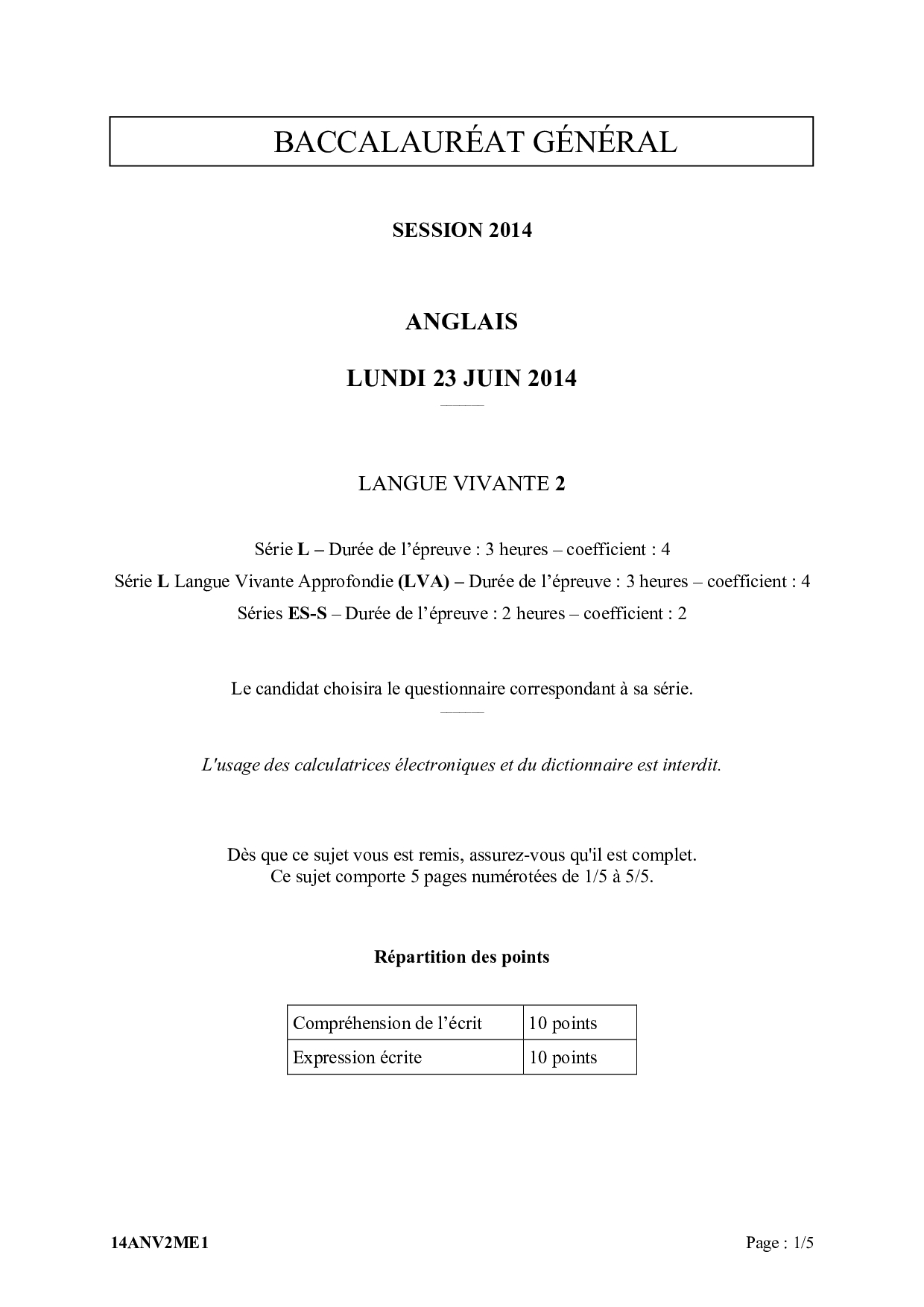 Bac S-ES-L Anglais LV2 Métropole 2014 - Sujet