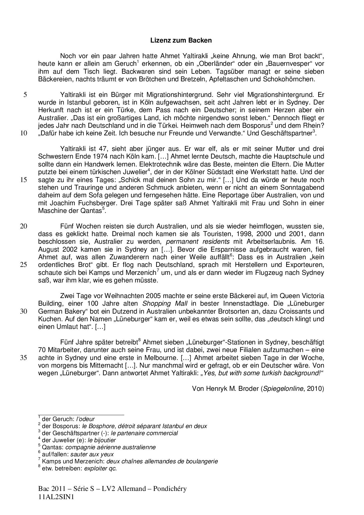 Bac S Allemand LV2 Pondichéry 2011 - Sujet
