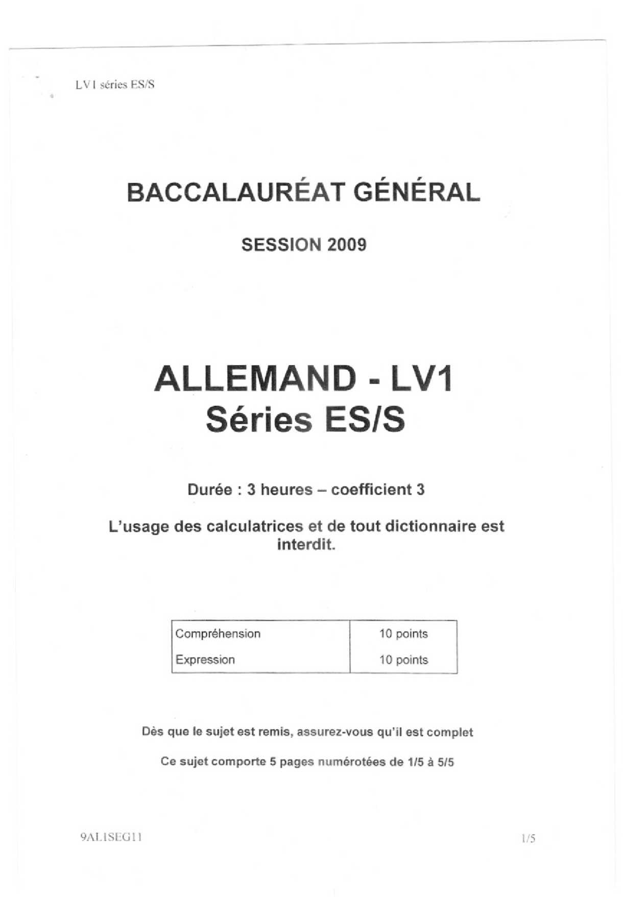 Bac S-ES Allemand LV1 Centres Etrangers Afrique 2009 - Sujet
