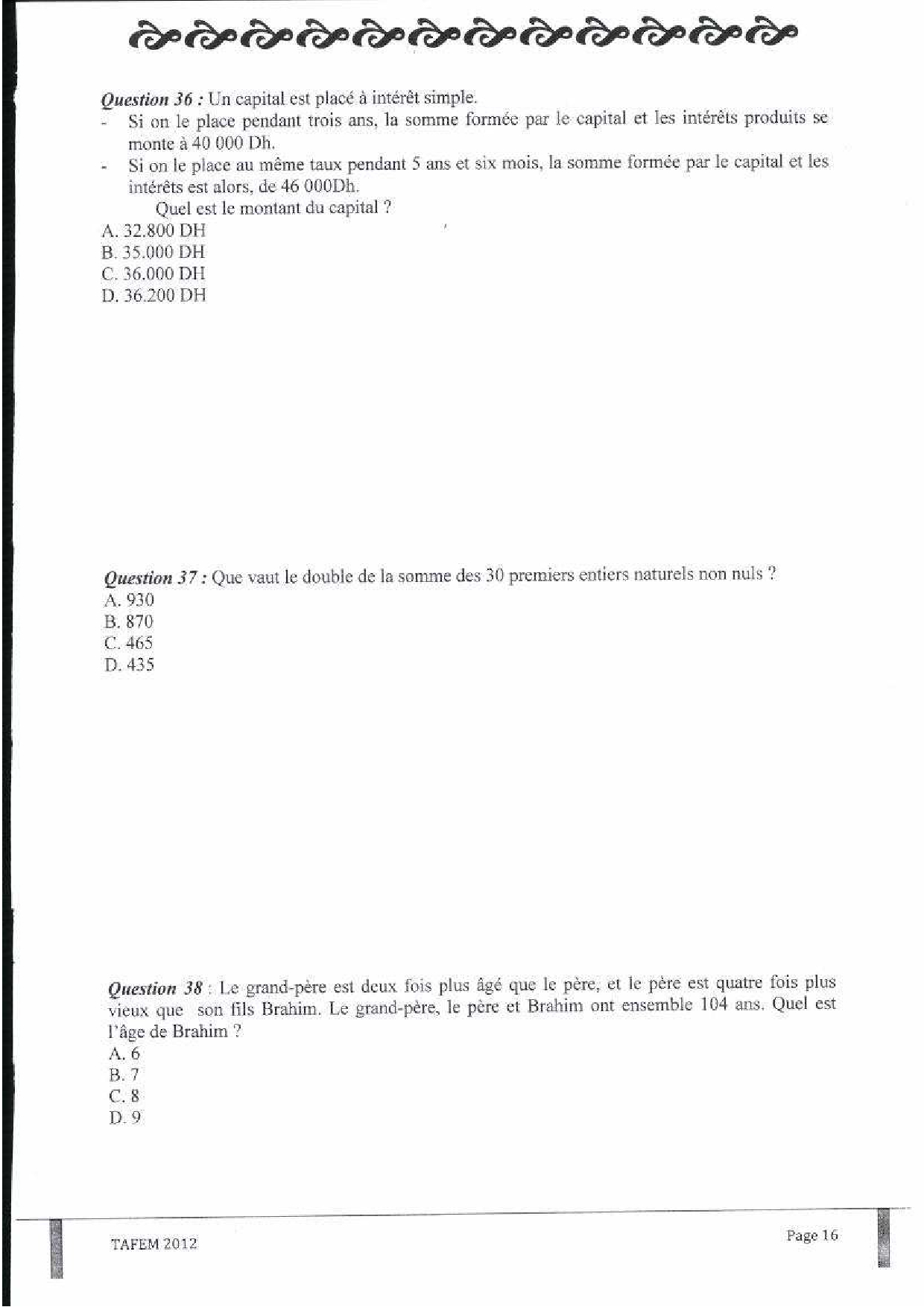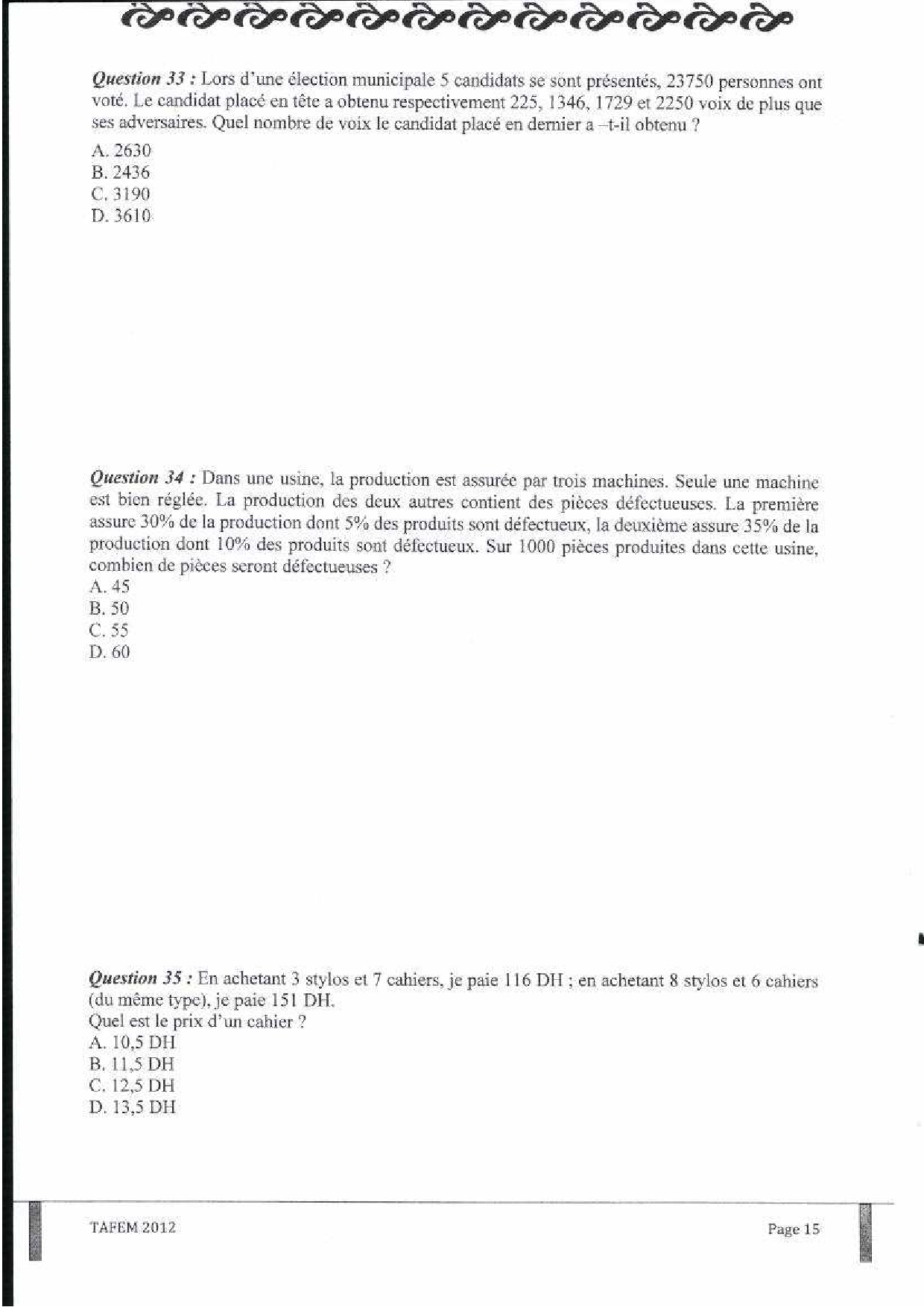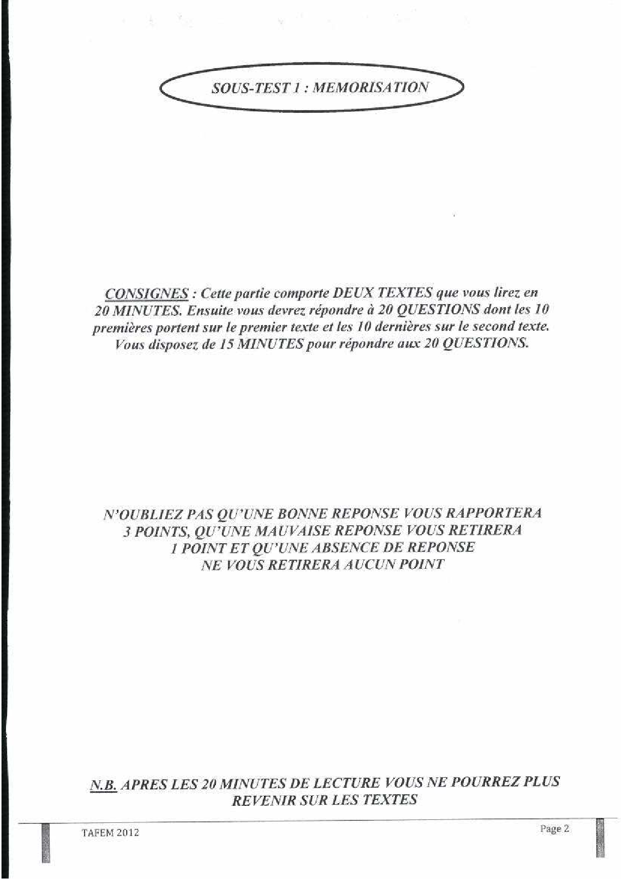 Test d'Admission à la Formation En Management (TAFEM) 2012 - Epreuve