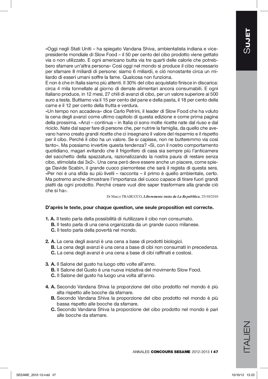 Concours SÉSAME 2012 - Italien (Epreuve)