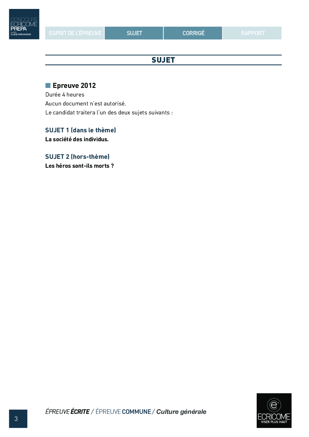 Concours Ecricome Prépa 2012 - Culture générale (Sujet)