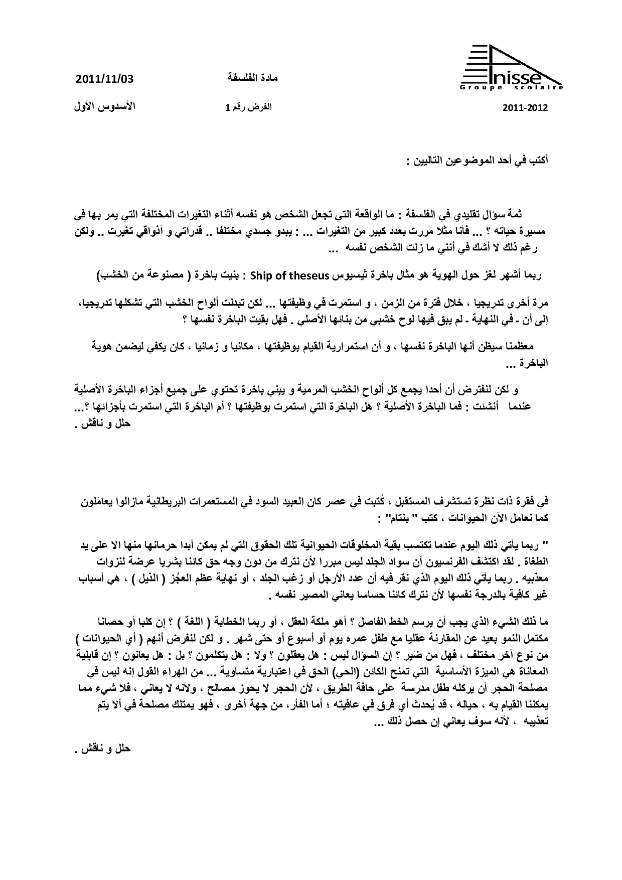 الفرض 1 نموذج 8 - الفلسفة ثانية باك علوم وتقنيات الدورة الأولى